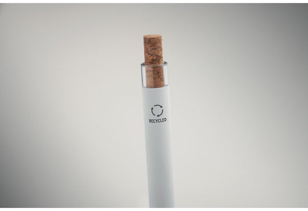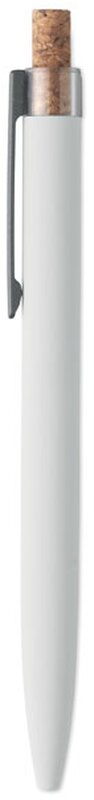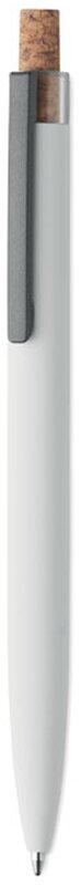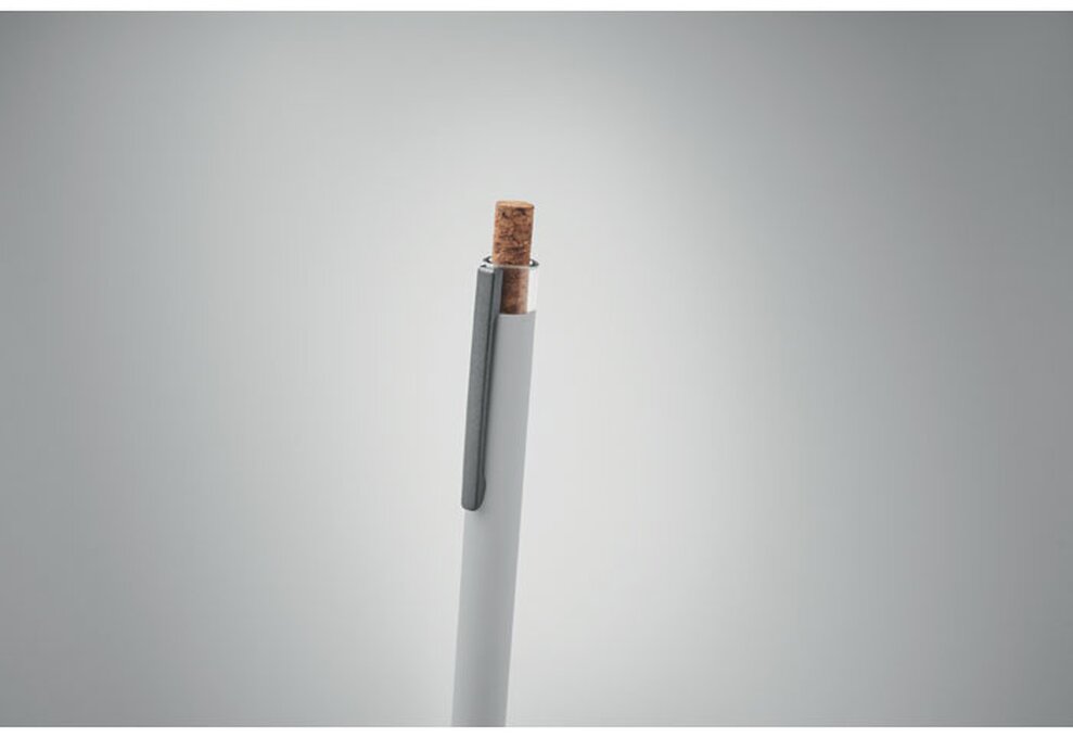 Kuličkové pero z recyklovaného hliníku s korkovým tlačítkem a kovovým klipem. Modrý inkoust.