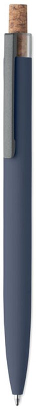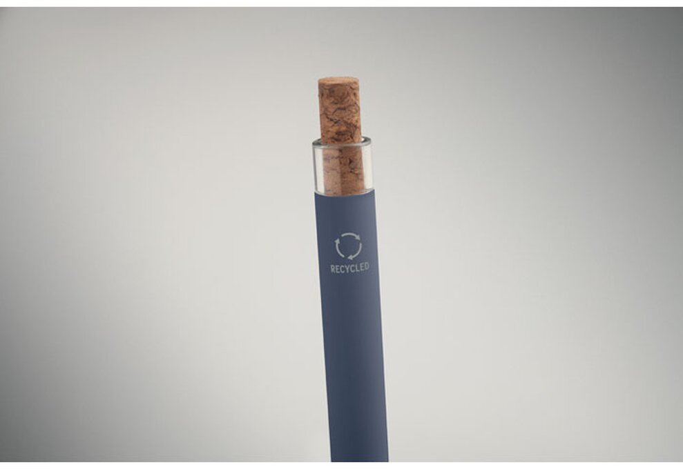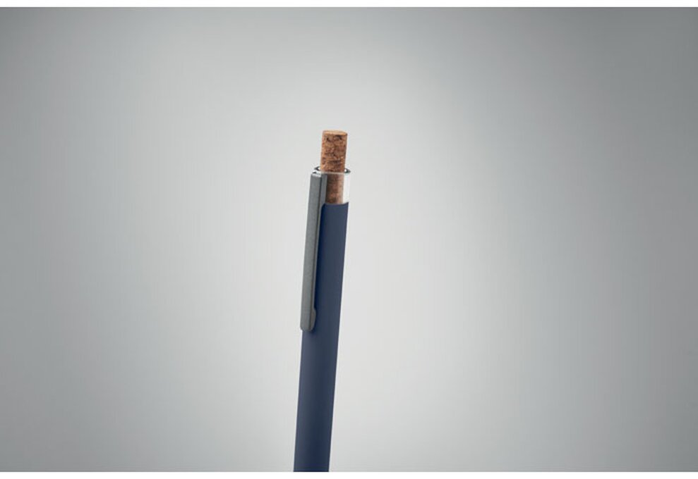 Kuličkové pero z recyklovaného hliníku s korkovým tlačítkem a kovovým klipem. Modrý inkoust.