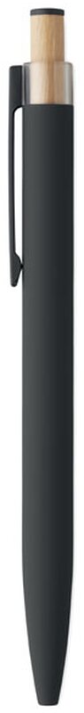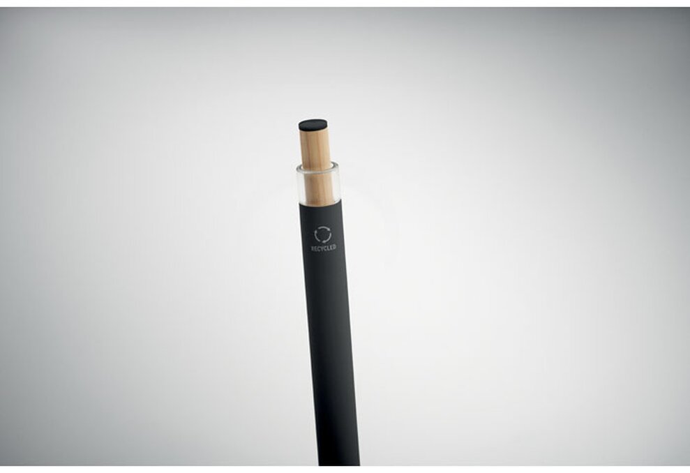 Kuličkové pero z recyklovaného hliníku s bambusovým tlačítkem a barevně sladěným kovovým klipem. Modrý inkoust.