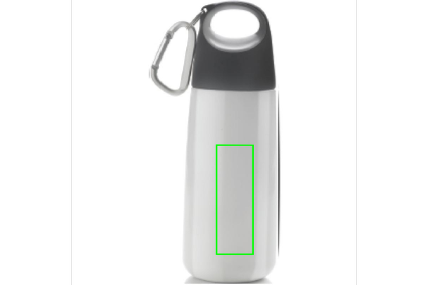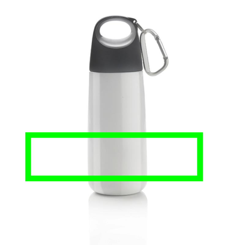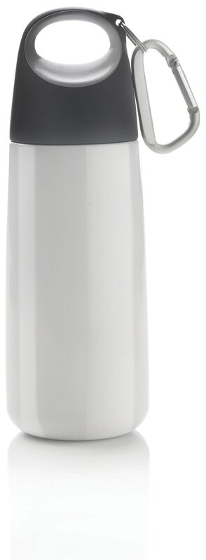 Kompaktní láhev o objemu 350 ml s matným povrchem a karabinou pro jednoduché upnutí na bath nebo pásek.
