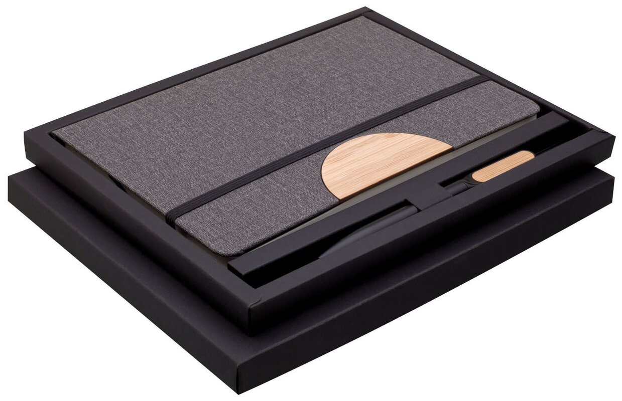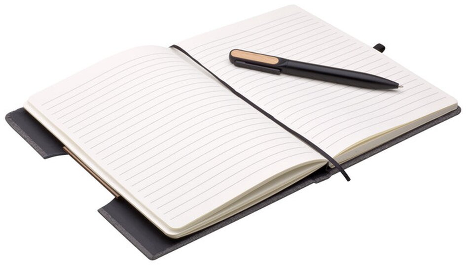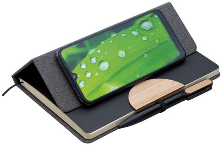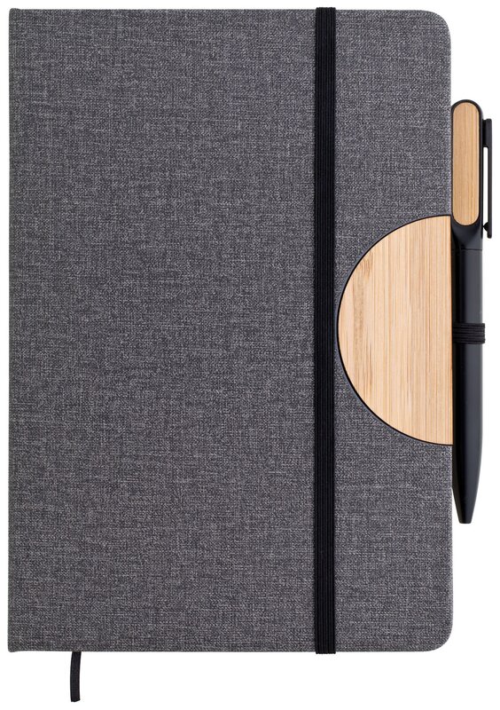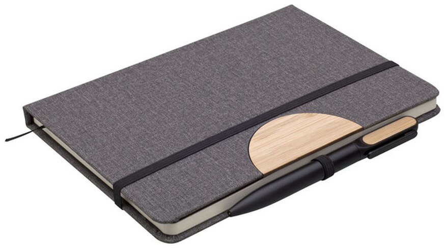 Poznámkový blok SAMBRO v textilních deskách. Desky jdou ohnout a lze jej použít jako stojánek na mobil. Obsahuje 80 linkovaných listů. Dodáváno v černé dárkové krabičce s otočnou propiskou s bambusovou vsadkou. Rozměry: 143x240x16 mm.