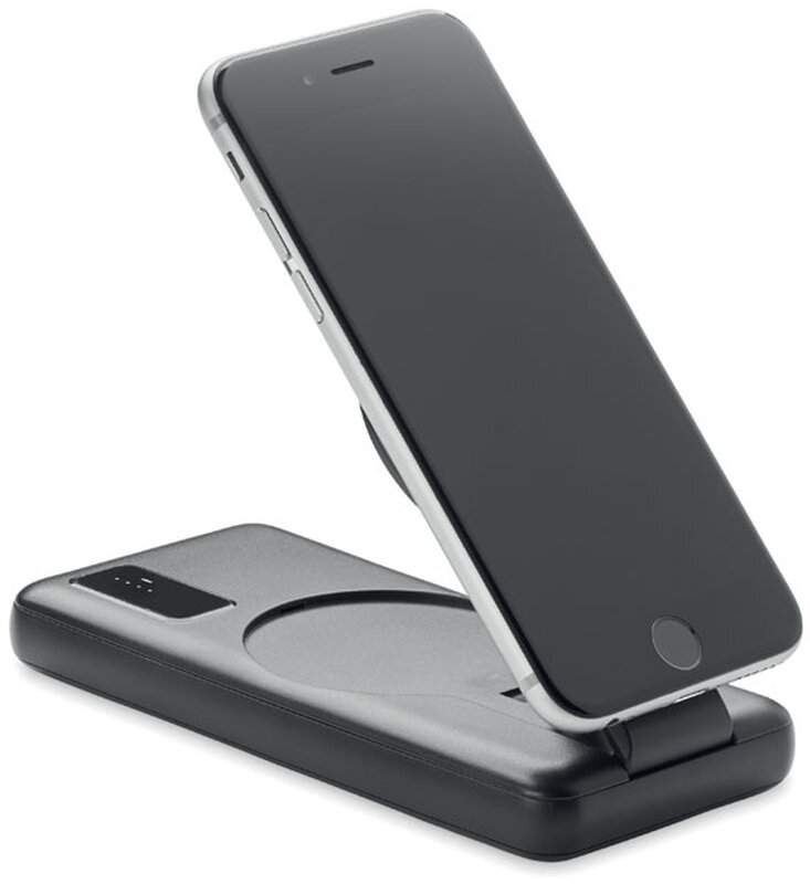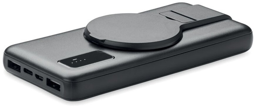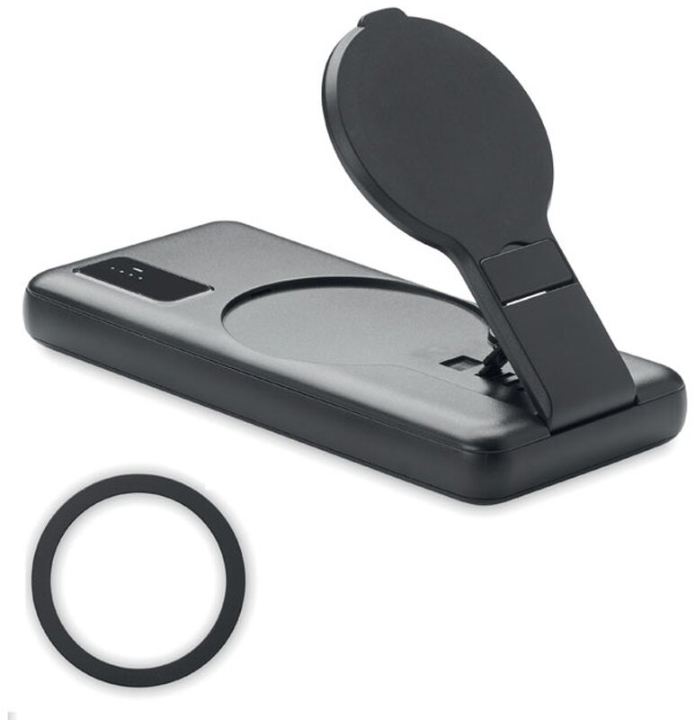 Magnetická bezdrátová nabíječka (15W), a powerbanka (10000 mAh) z ABS s funkcí stojánku. Vstup: micro B, Type-C. Výstup 2x USB-A In/ Type-C/ DC 9V/1,66A (15W) ideální pro rychlé nabíjení. Kompatibilní s iPhone® 12 a novějšími. Obsahuje další magnetický kovový kroužek pro podporu nabíjení nemagnetických bezdrátových nabíjecích telefonů. S podporou napájení (PD) pro nabíjení nejnovějších notebooků.