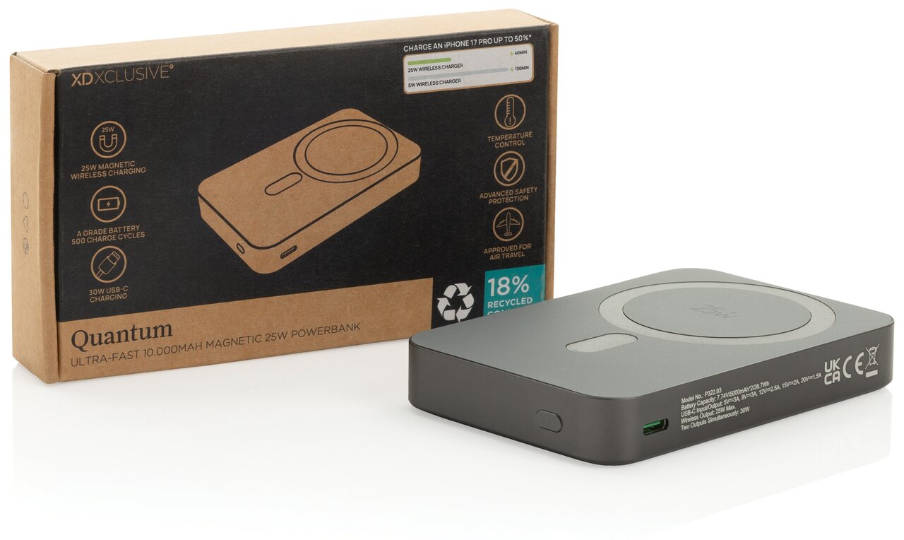 Powerbanka Quantum RCS s kapacitou 10 000 mAh nabízí ultrarychlé 25W magnetické bezdrátové nabíjení pro přenosné a výkonné každodenní použití. Baterie třídy A udrží vaše zařízení nabité po celý den, zatímco magnetické bezdrátové nabíjení zajišťuje bezpečné a efektivní připojení.