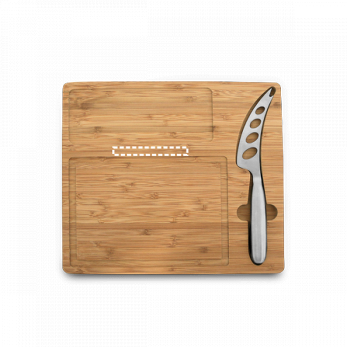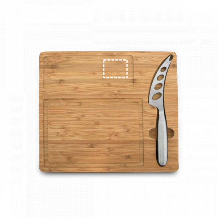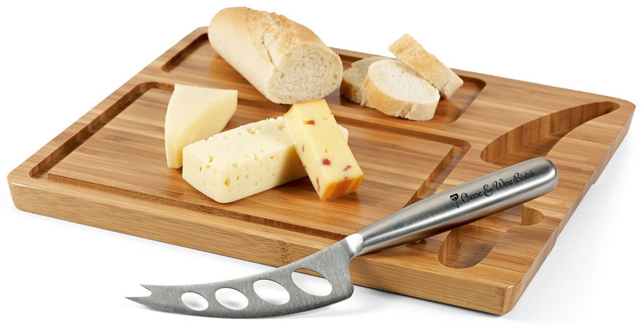 Bambusové prkénko na sýr s nožem. Výrobek se dodává v kraftové krabici.
