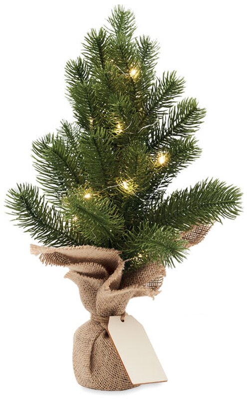 Malý umělý vánoční stromek AVETO s 20 LED světélky. Na jutovém podstavci se dřevěnou dárkovou visačkou. Součástí balení NEJSOU 2 baterií AA.