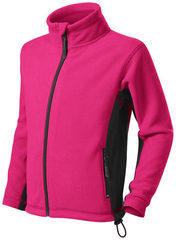 Dětská fleecová mikina s kontrastními vsadkami a detaily. Dvě kapsy na zip na předním dílu. Stojáček zakončený krytkou pro ochranu brady. Dekorativní prošití, spodní lem ke stažení elastickou šňůrkou. Antipillingová úprava vnější strany materiálu.