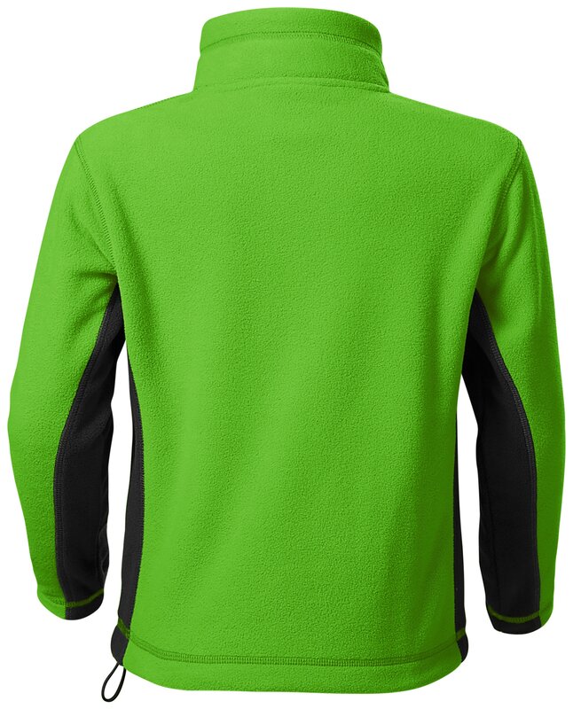 Dětská fleecová mikina s kontrastními vsadkami a detaily. Dvě kapsy na zip na předním dílu. Stojáček zakončený krytkou pro ochranu brady. Dekorativní prošití, spodní lem ke stažení elastickou šňůrkou. Antipillingová úprava vnější strany materiálu.