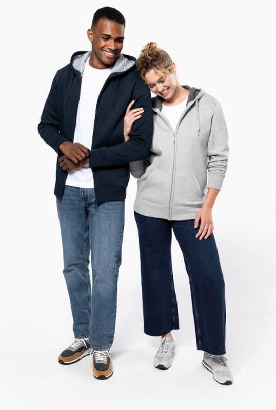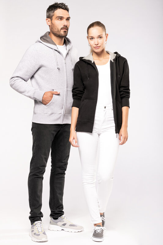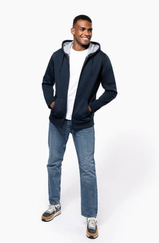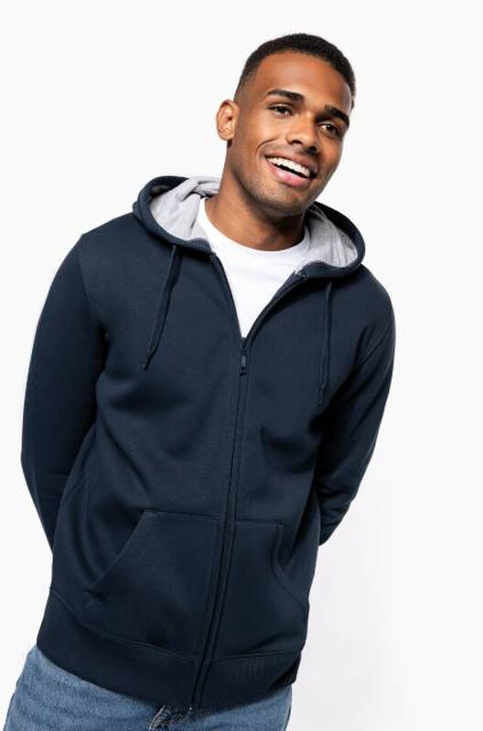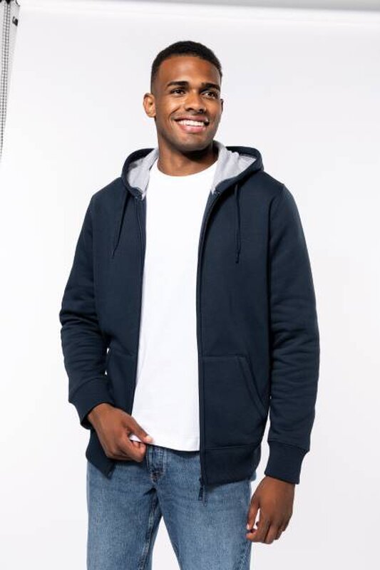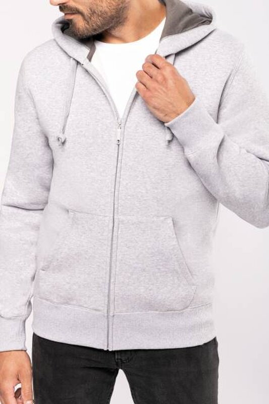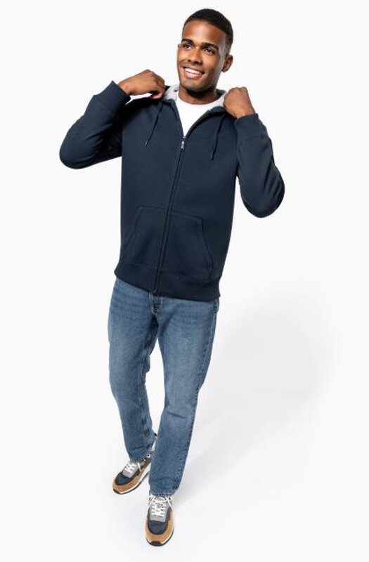 Límcová vsadka a kapuce v kontrastní barvě (šedá), 2-vrstvá kapuce, vsazené rukávy, široké žebrované manžety na rukávech a lemu, YKK zip, klokaní kapsa, LSF (low shrinkage fleece) pro menší srážení, pratelné na 40°, lze sušit v sušičce při nízké teplotě, nelze chemicky čistit 360g/m², 80% předepraná prstencová bavlna, 20% polyester, silikonové praní