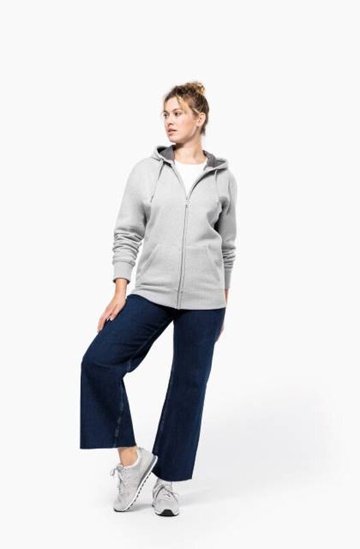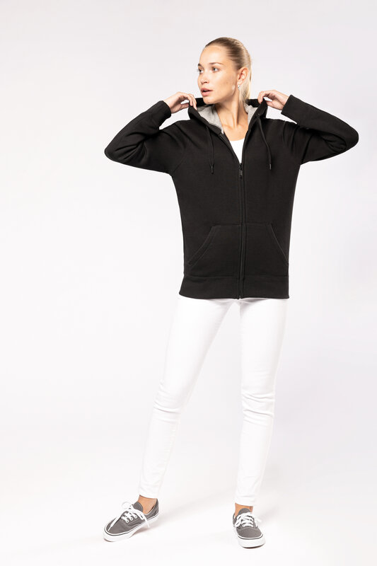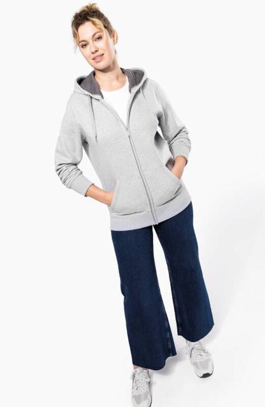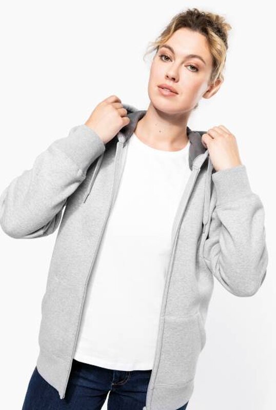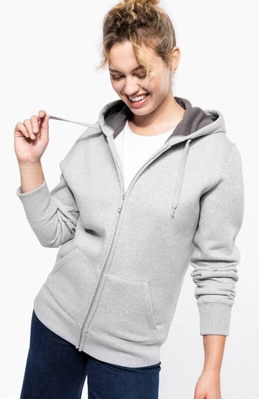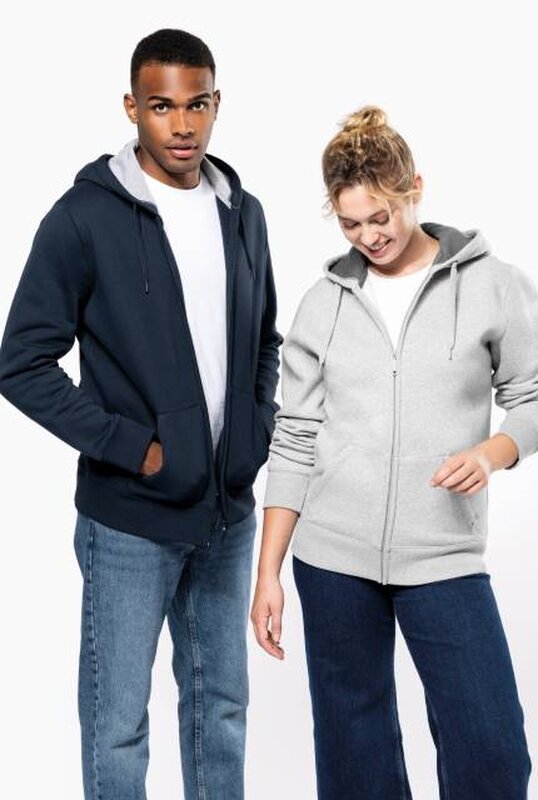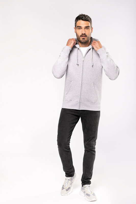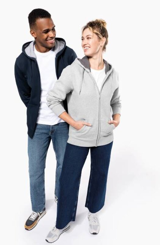 Límcová vsadka a kapuce v kontrastní barvě (šedá), 2-vrstvá kapuce, vsazené rukávy, široké žebrované manžety na rukávech a lemu, YKK zip, klokaní kapsa, LSF (low shrinkage fleece) pro menší srážení, pratelné na 40°, lze sušit v sušičce při nízké teplotě, nelze chemicky čistit 360g/m², 80% předepraná prstencová bavlna, 20% polyester, silikonové praní