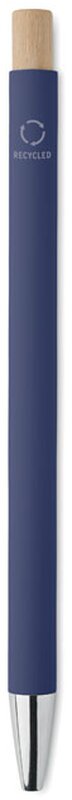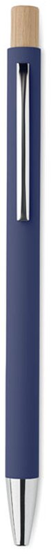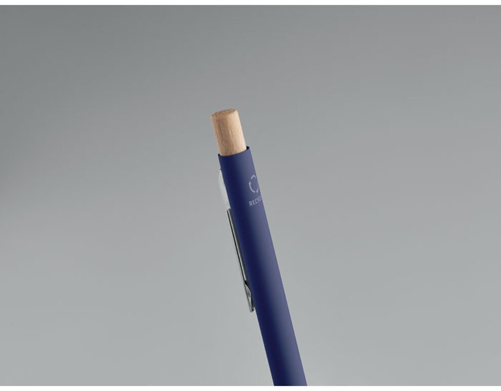 Kuličkové pero z recyklovaného hliníku s bambusovým tlačítkem. Stříbrný hrot a klip. Modrý inkoust.