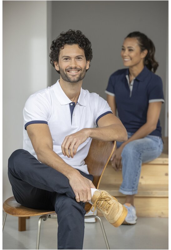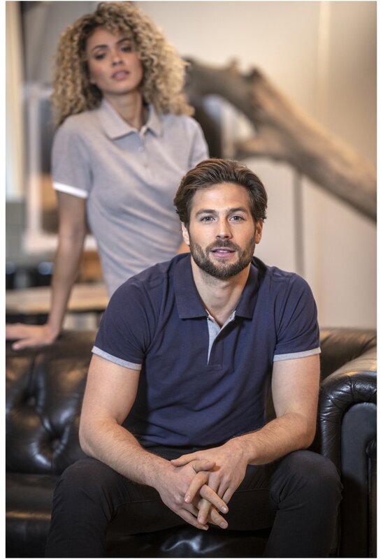 Plochý žebrový límeček. Žebrový úplet manžetek. Kontrastní barevná vnitřní léga a žebrované manžety. Zapínání na dva knoflíky. Detaily s vyšívacím stehem. Saténová lemovka výstřihu. Boční rozparky se saténovou lemovkou. Sedlo. Předsunutá zpevňující lemovka výstřihu s řetízkovým švem. Gravírované knoflíčky ve stejné barvě. Potisk štítku technologií heat transfer pro větší pohodlí.