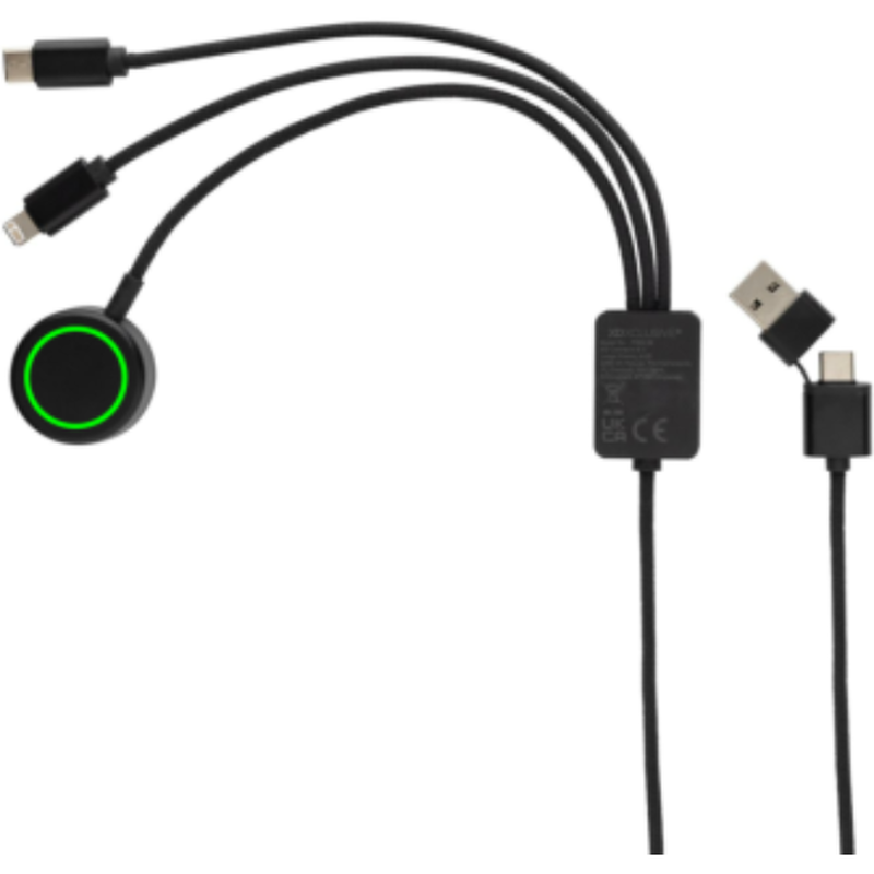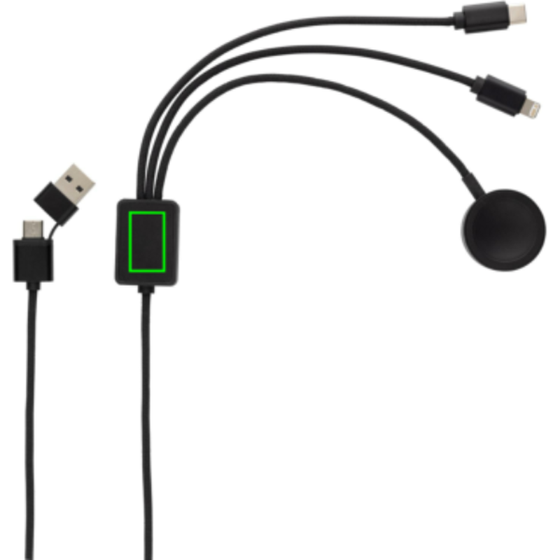 Multifunkční nabíjecí kabel Terra 6v1 s nabíječkou hodinek z recyklovaného hliníku, TPE, ABS a plastu s RCS certifikací, ideální pro firemní potisk. Rekordních 62% recyklovaný obsah. Duální vstup (USB-A + USB-C), dvojitý výstup a 2,5W nabíječka hodinek (Apple Watch/Samsung) = 6 možností nabíjení.