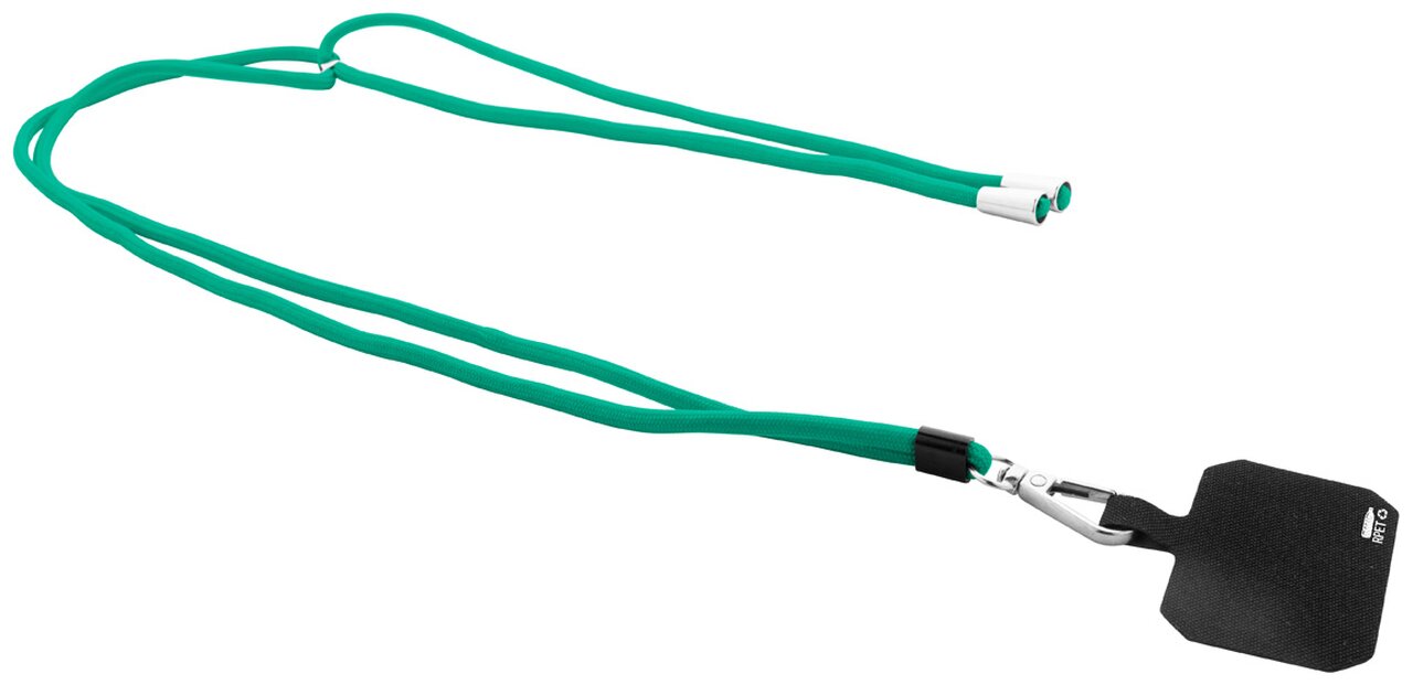 RPET lanyard s nastavitelnou délkou pro držák na mobil s kovovou karabinou a textilní vložkou do krytu telefonu.