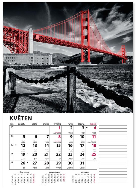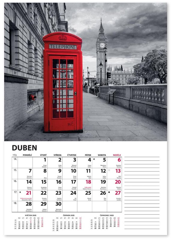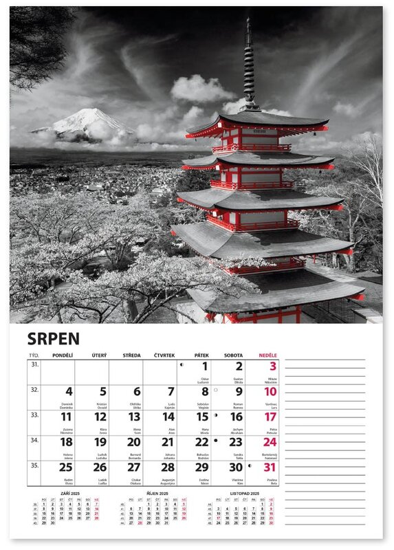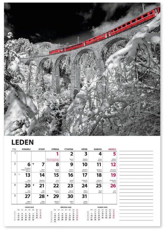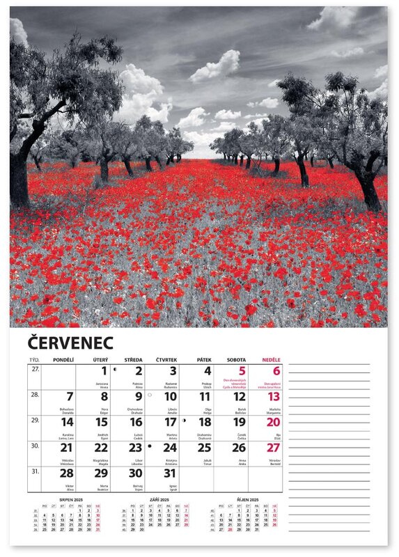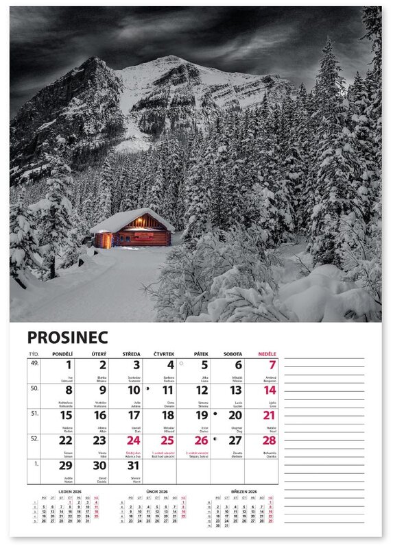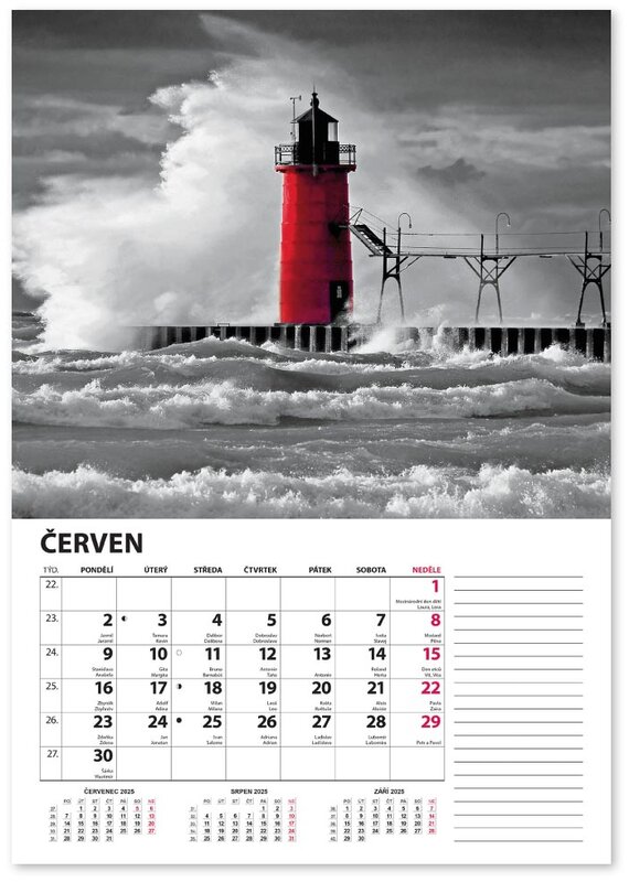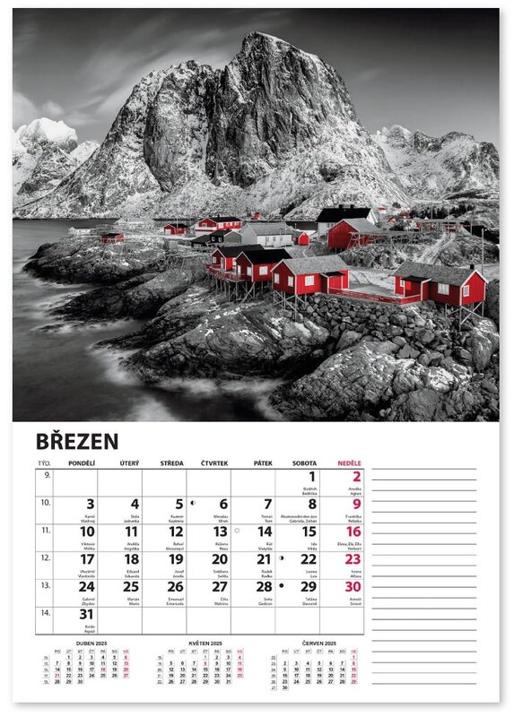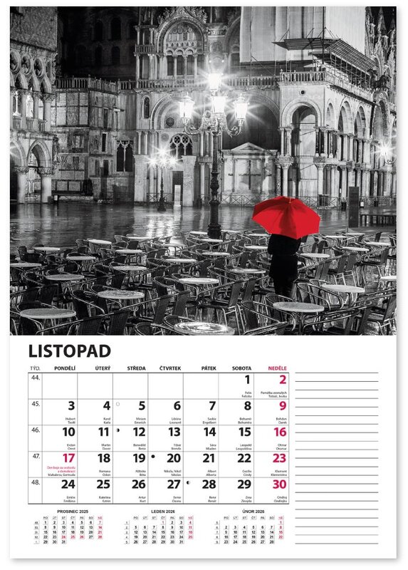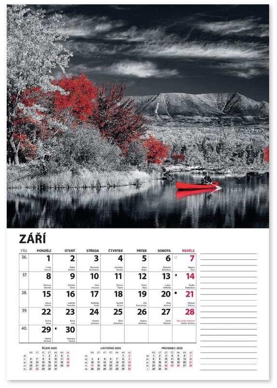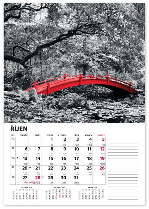 Nástěnný kalendář v černobílém provedení se zvýrazněnou červenou barvou.