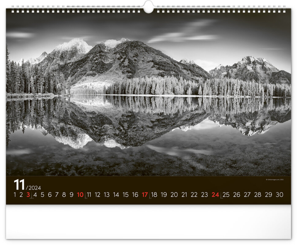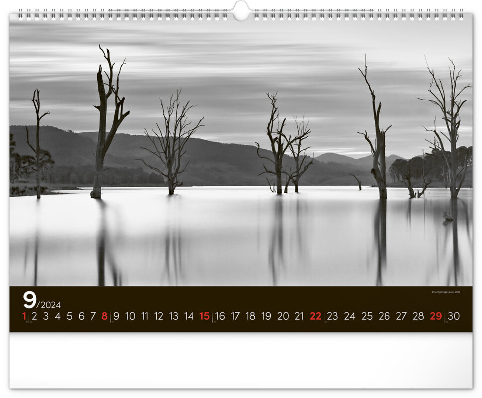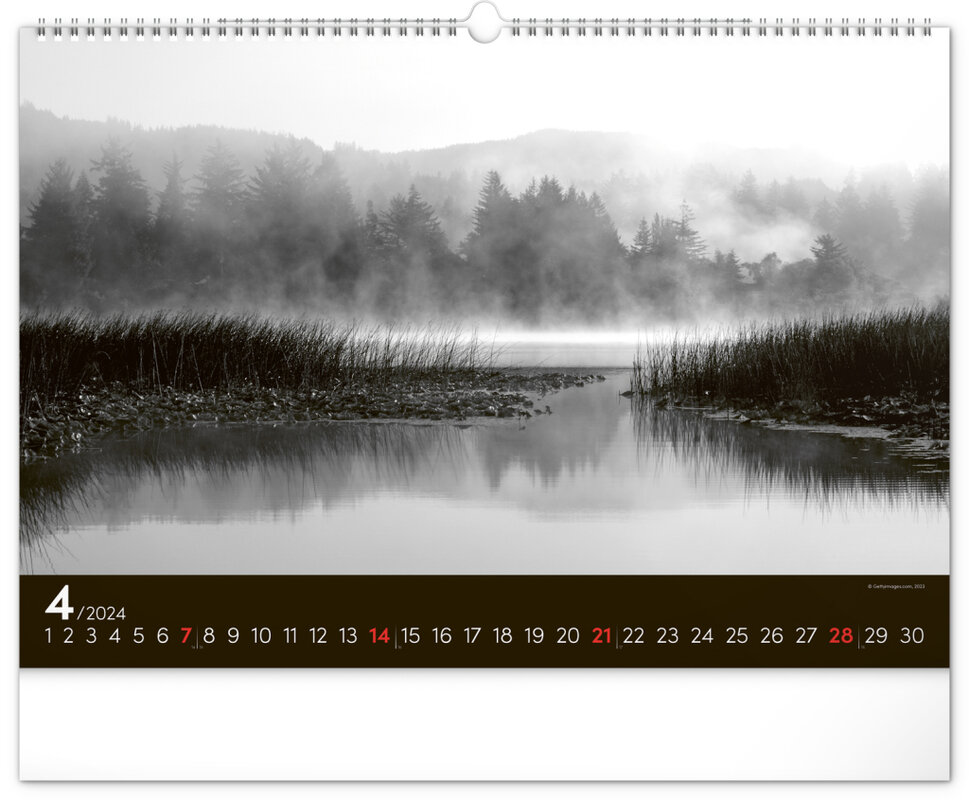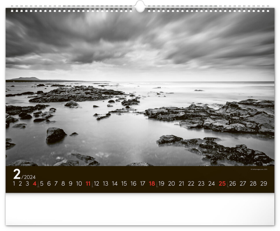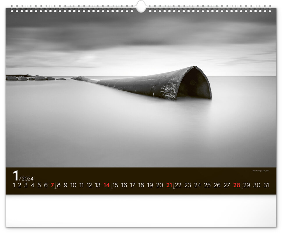 Zasněte se při pohledu na dvanáct úchvatných snímků krajiny v černobílém hávu. Jednoduché kalendárium na černém pozadí.