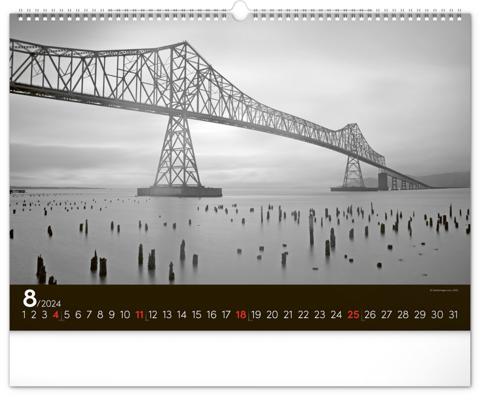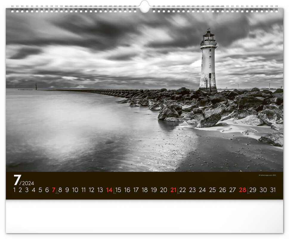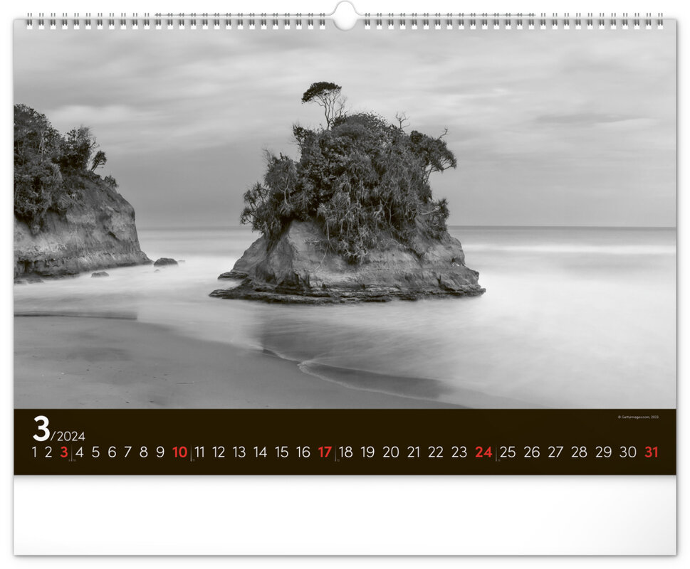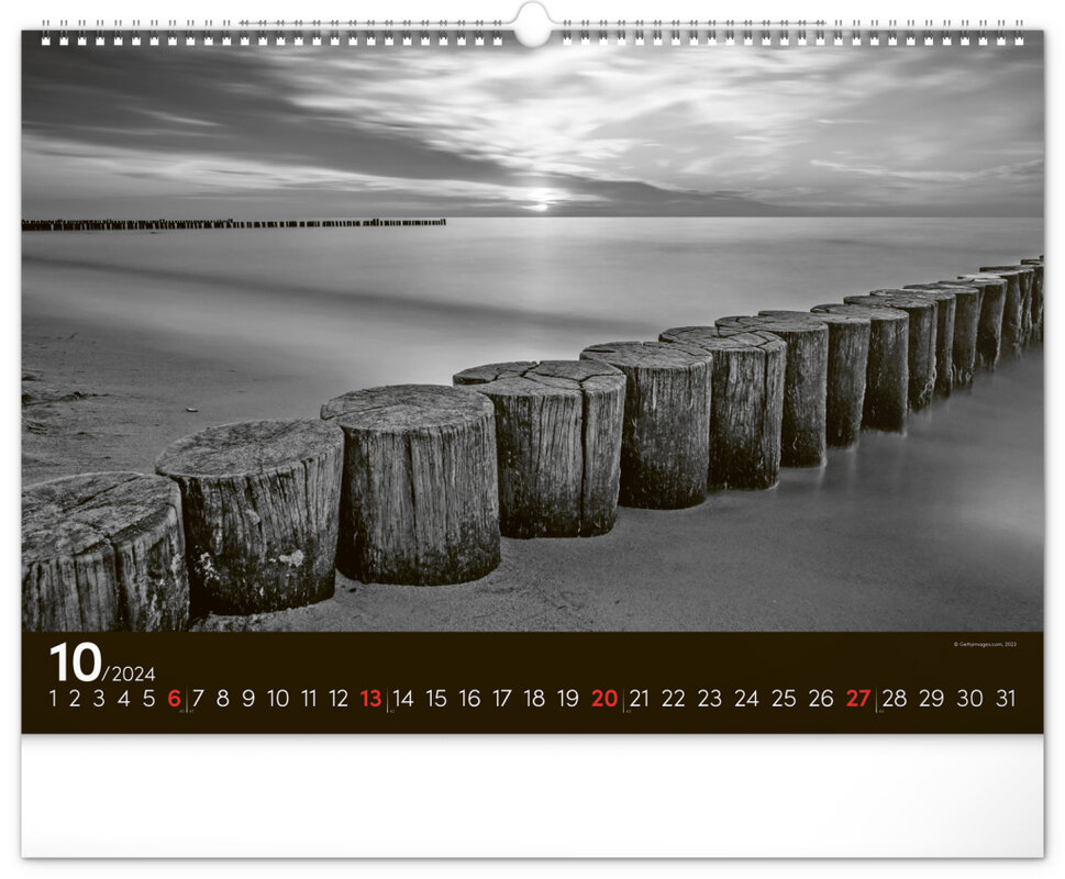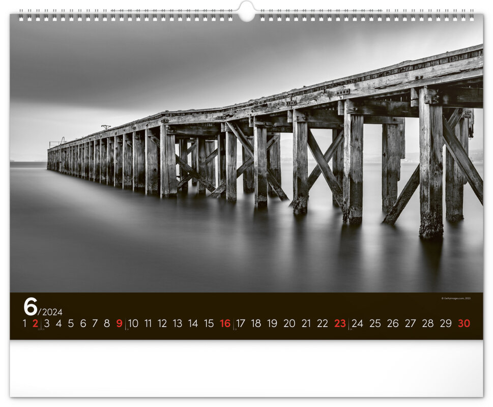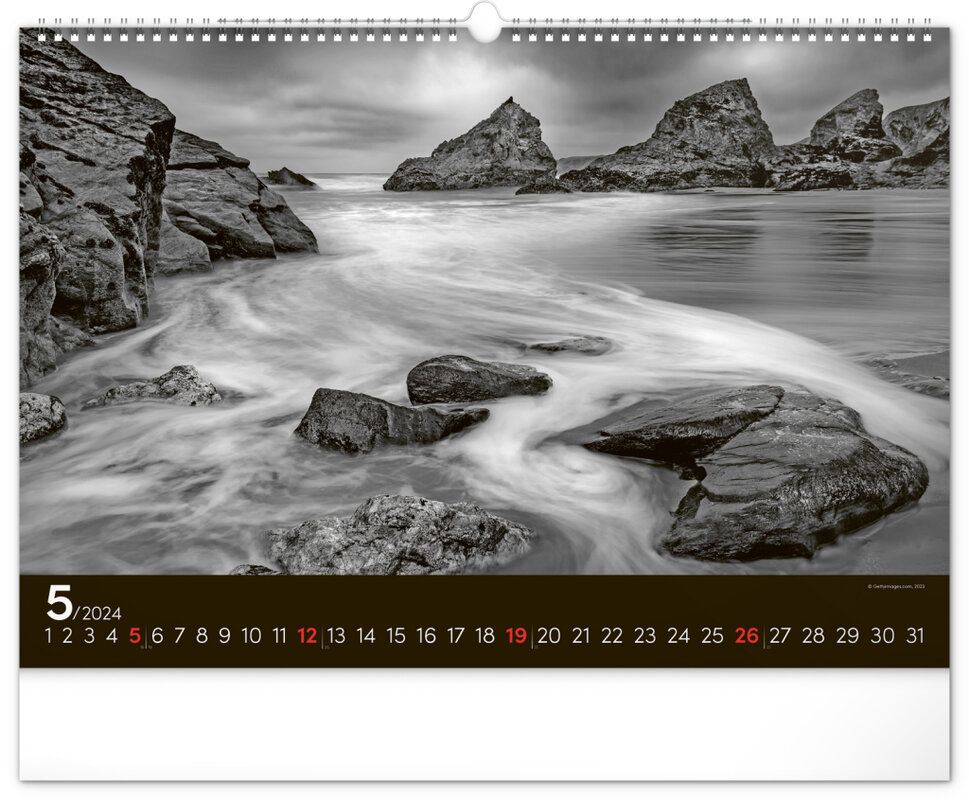 Zasněte se při pohledu na dvanáct úchvatných snímků krajiny v černobílém hávu. Jednoduché kalendárium na černém pozadí.