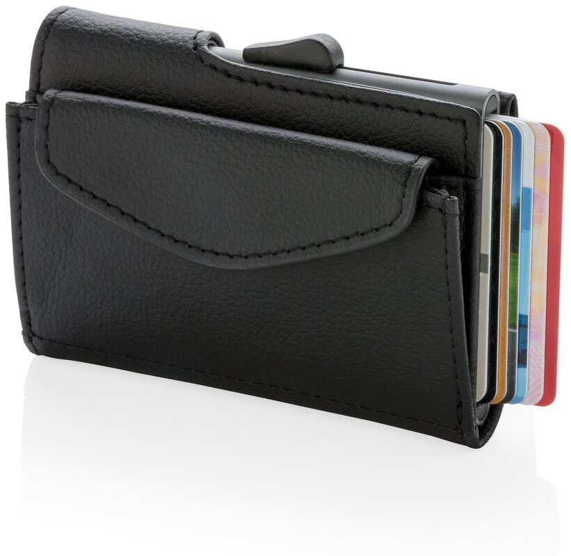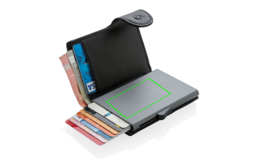 Pevné hliníkové a bezpečné pouzdro na karty s peněženkou zabraňuje rozmáhajícím se elektronickým krádežím z RFID karet, ohnutí prasknutí nebo ztrátě. Pojme až 7 klasických či 5 embosovaných karet. Peněženka má extra kapsičku pro mince či klíče.