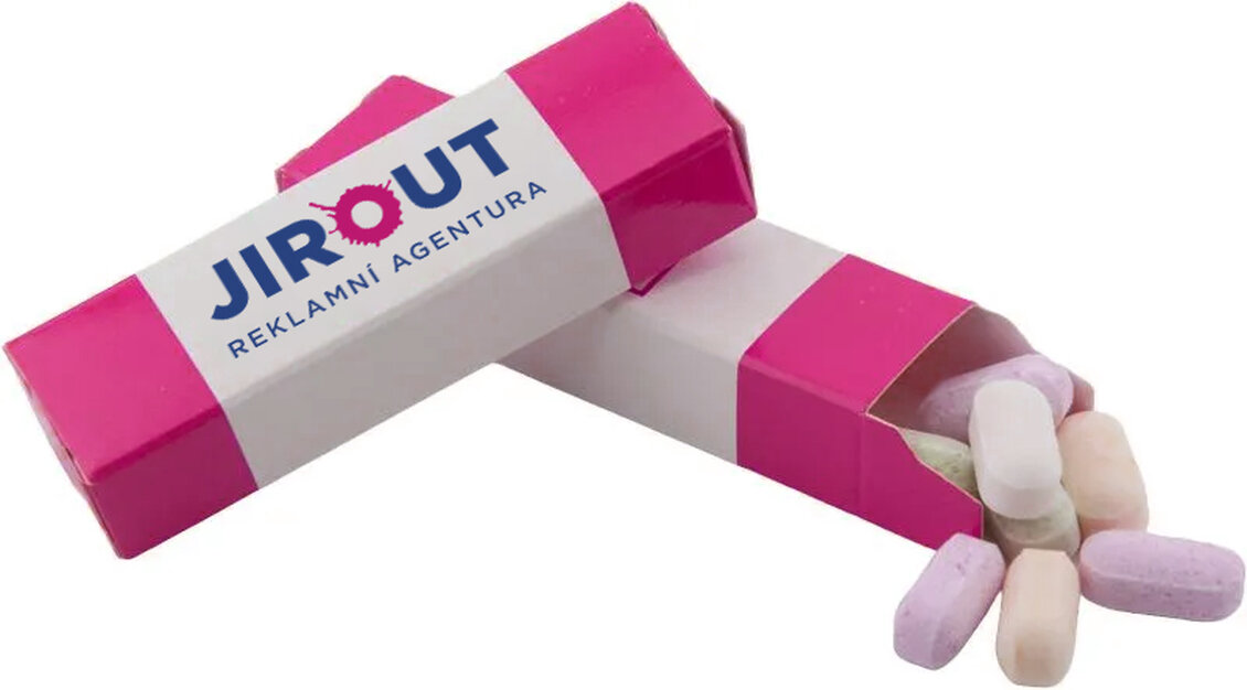 Kompaktní balení ovocných pudrových pastilek je ideální jako sladký reklamní dárek, drobná pozornost pro zákazníky nebo příloha ke katalogům a objednávkám. Díky plnobarevnému potisku ve CMYKu je krabička skvělou plochou pro vaši značku nebo kampaň.