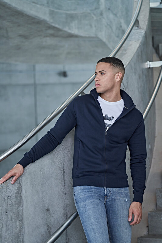 3-vrstvá tkanina, žebrovaný stojatý límec a pas, 2 boční kapsy se zipem, dvojité švy, zdrsněná vnitřní strana 310-320g/m², 70% česaná prstencová bavlna, 30% polyester