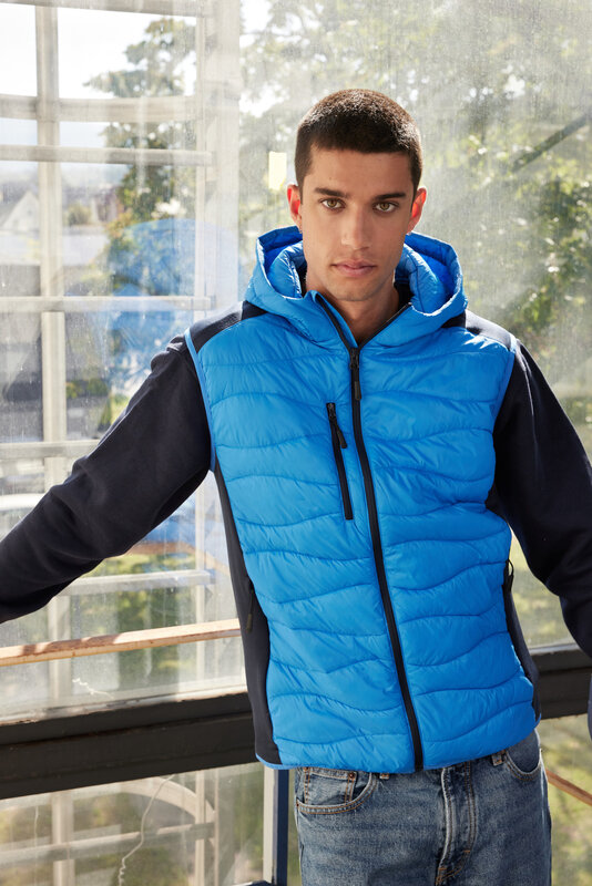 Pánská sportovní vesta s kapucí a prošíváním, Prošívaný je přední a zadní díl a kapuce, Na bocích strečový fleece, Zip po celé délce, ochrana brady, Náprsní kapsa a boční kapsy na zip, 2 vnitřní kapsy, Velmi teplá díky výplni sorona®AURA, Značkové zipy - YKK