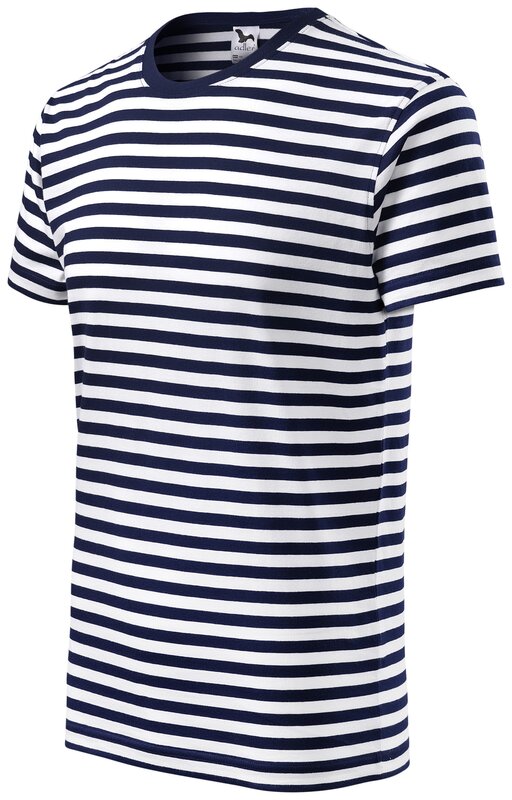 Kvalitní tričko s proužkem v kombinaci bílá a námořní modrá. Lem průkrčníku ze žebrového úpletu s přídavkem 5 % elastanu. Vnitřní část zadního průkrčníku začištěna a zpevněna páskou. Zpevňující ramenní páska v barvě vrchového materiálu. Střih s bočními švy. Vhodné pro potisk a výšivku.