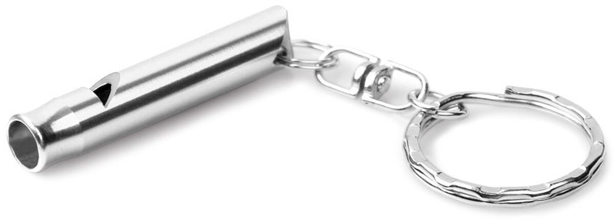 TRUDY je kovová píšťalka, která se dá připnout na klíče/batoh.