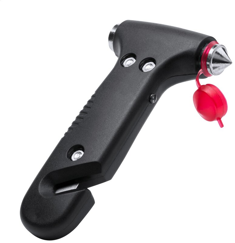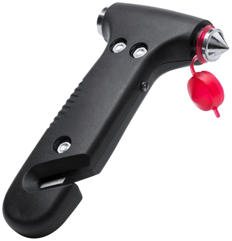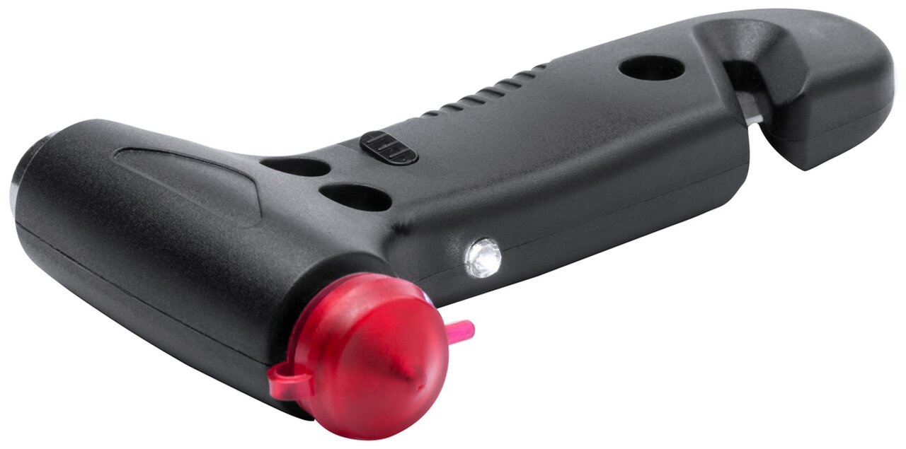 Multifunkční bezpečnostní kladívko s řezákem pásů a 1 LED světlem, dodáváno s knoflíkovými bateriemi.