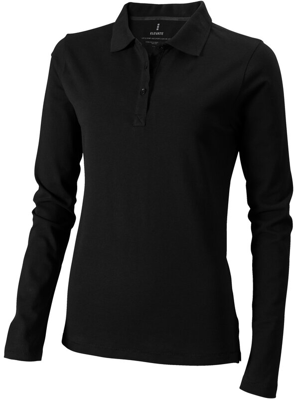 Dámská polokošile s dlouhým rukávem Oakville. Předsráženo. Polo tričko má 1x1 žebrový úplet výstřihu, boční rozparek s vnitřní sametovou lemovkou. Předsunutá zpevňující lemovka výstřihu s řetízkovým stehováním. Logo tištěné v barvě na zádech. Pánské tričko má výstřih se 2 knoflíčky, dámské se 3. Knoflíky s gravírovaným logem. Detaily s vybraným stehem. Hedvábná lemovka výstřihu. Materiál: 90% bavlna a 10% viskóza. Gramáž polo trička je 200 g/m².