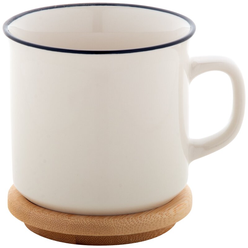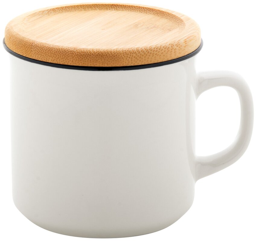 Vysoce kvalitní porcelánový retro hrnek v bílé barvě s černým okrajem a bambusovým podtáckem, 320 ml.