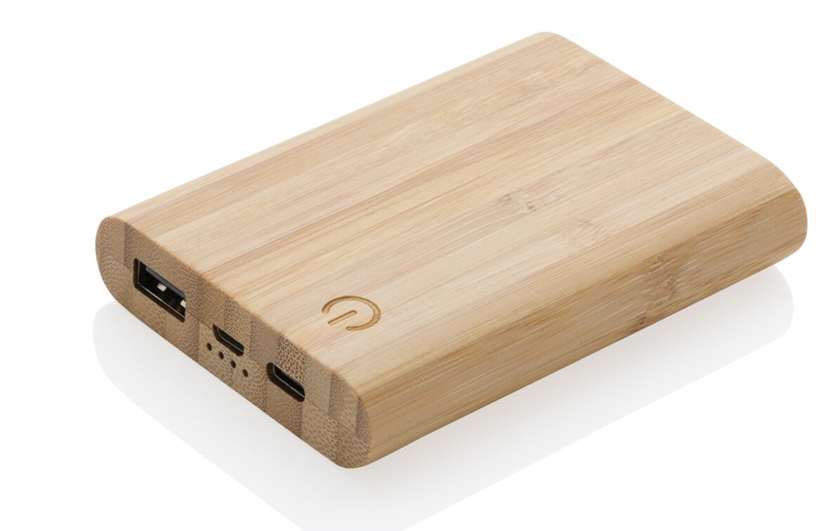 Powerbanka s kapacitou 5 000 mAh vyrobená ze 100 % FSC certifikovaného bambusu. Obsahuje velmi kvalitní lithium polymerovou baterii řady A s kapacitou 5 000 mAh pro plné nabití telefonu až 3x a také má indikátory stavu nabití. Micro USB a USB C vstup: 5V/2A. USB A, Micro USB a USB C výstup: 5V/2A. Také obsahuje nabíjecí kabel z recyklovaného TPE. Produkt je Bez PVC a zabalen v FSC® krabičce.