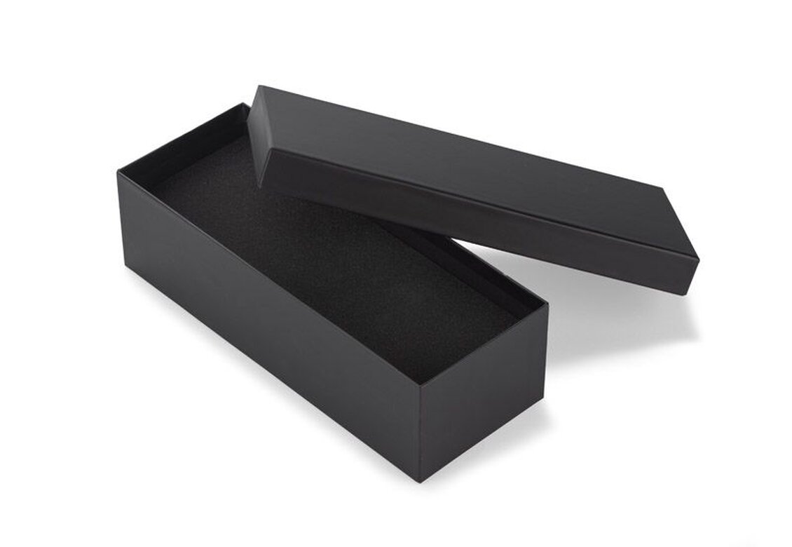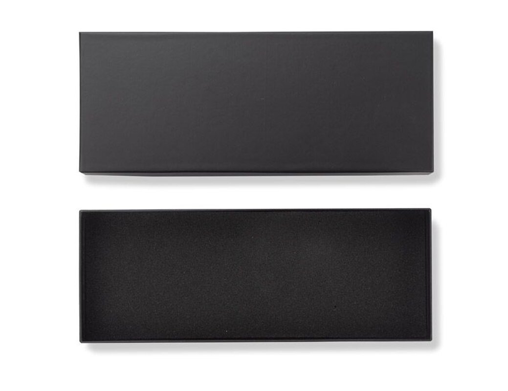 Luxusní černá dárková krabička z pevného materiálu potažená fólií, ideální pro firemní dárky s možností potisku vašeho loga. Vystlaná pěnou připravenou k vystřižení pro termo láhve nebo jiné výrobky. Vyrobeno v Polsku s vysokou kvalitou zpracování – perfektní pro vytvoření prémiových dárkových sad nebo jako univerzální obal.