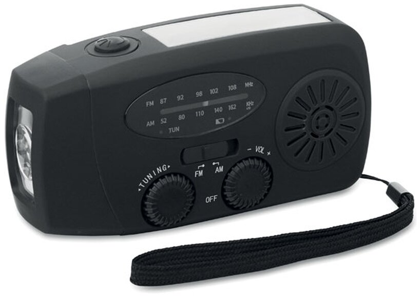 Přenosné AM/FM rádio z ABS plastu s LED svítilnou (2 nastavení) a powerbankou 1200 mAh pro nouzové nabíjení. Vlastní napájení solárním panelem a ručním dynamem.