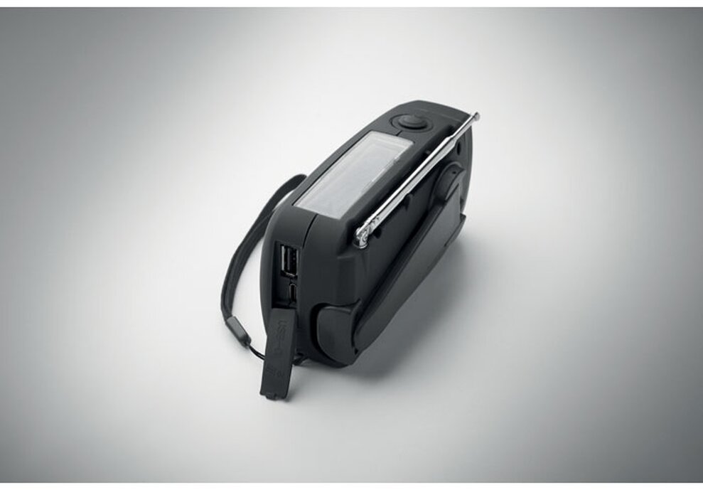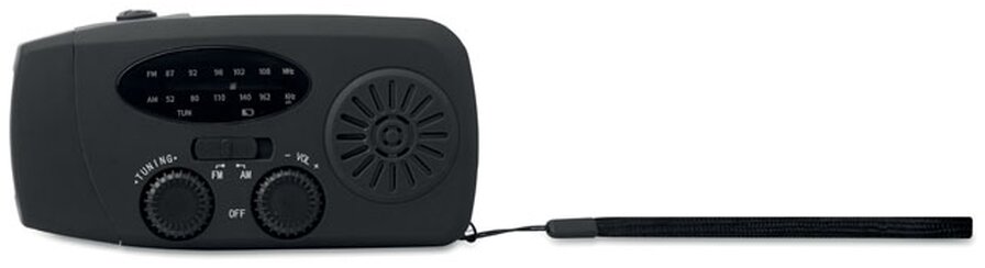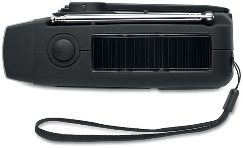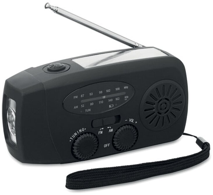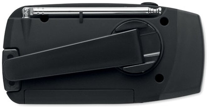 Přenosné AM/FM rádio z ABS plastu s LED svítilnou (2 nastavení) a powerbankou 1200 mAh pro nouzové nabíjení. Vlastní napájení solárním panelem a ručním dynamem.