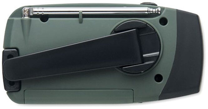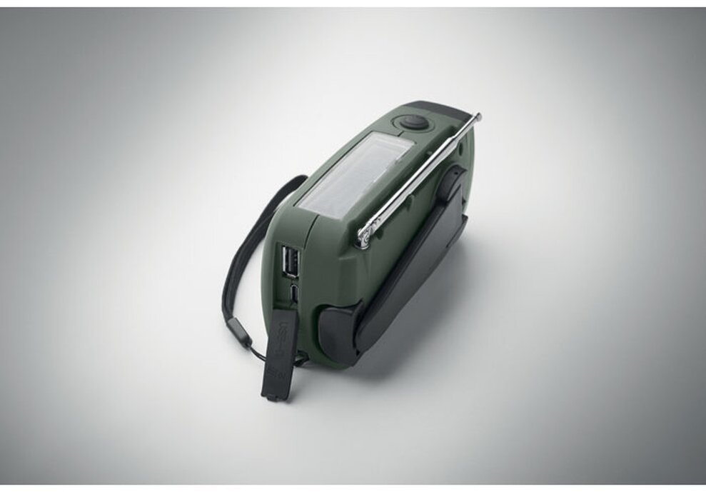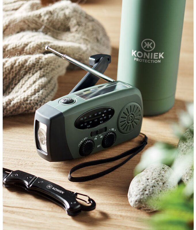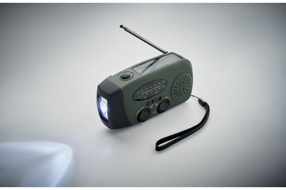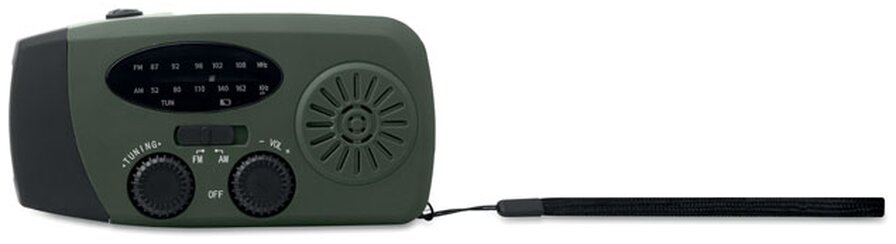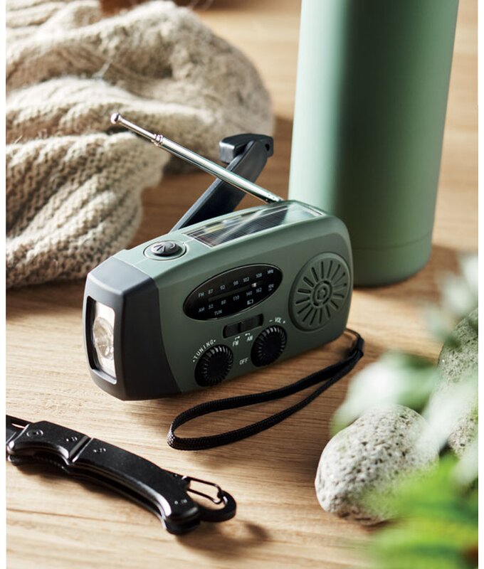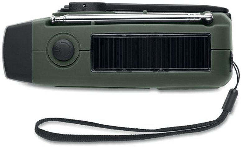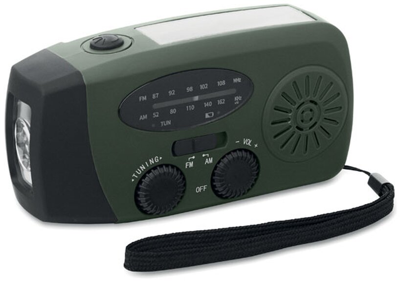 Přenosné AM/FM rádio z ABS plastu s LED svítilnou (2 nastavení) a powerbankou 1200 mAh pro nouzové nabíjení. Vlastní napájení solárním panelem a ručním dynamem.