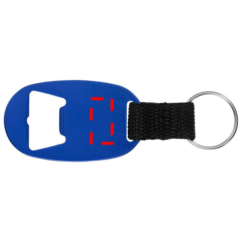 Přívěsek na klíče otvírák. Hliníkový otvírák s tkaným nylonovým řemínkem a dvojitým kovovým kroužkem na klíče. Hliník a nylon.