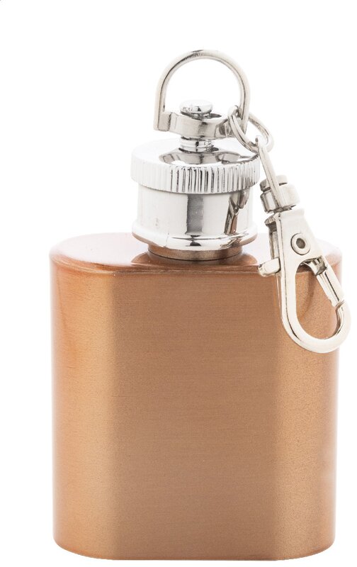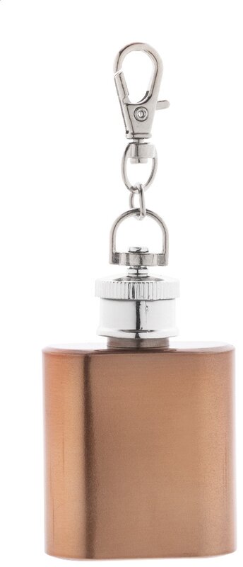 Mini butylka z recyklované nerezové oceli s lesklým kovovým povrchem a karabinou na klíče. 30 ml.