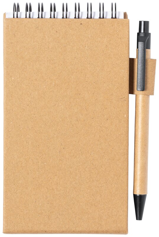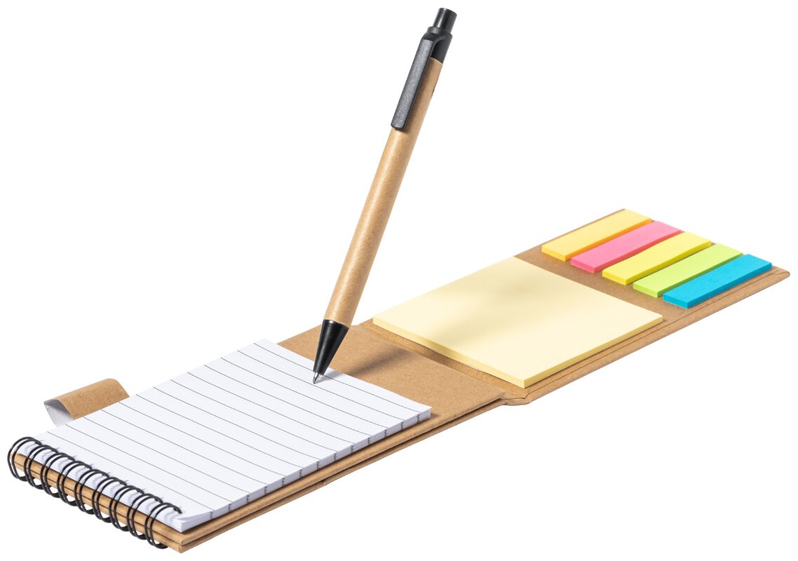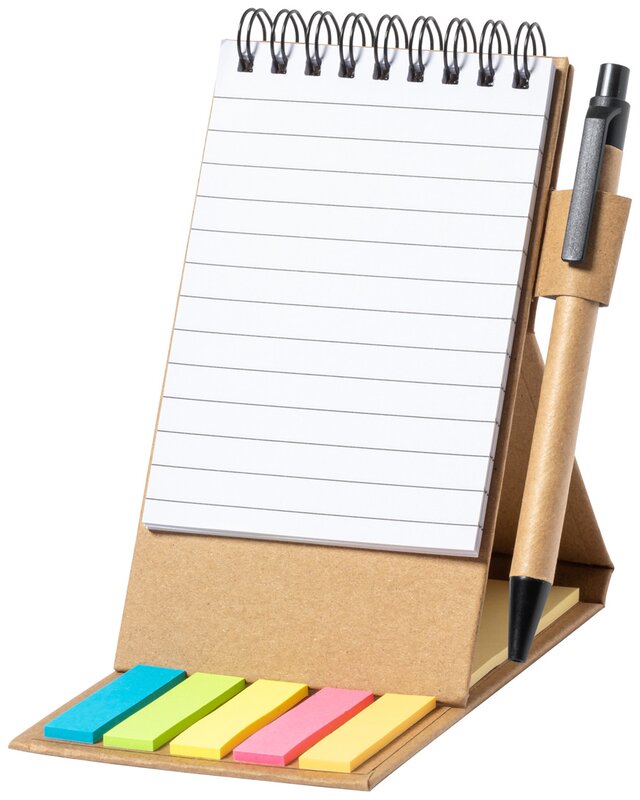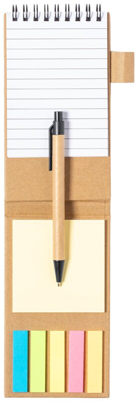 Spirálový poznámkový blok z recyklovaného papíru s 30 linkovanými listy, 25 samolepicími papírky a 125 značovači stránek (v 5 různých barvách). S funkcí držáku mobilního telefonu. Včetně kuličkového pera z recyklovaného papíru s modrou náplní.
