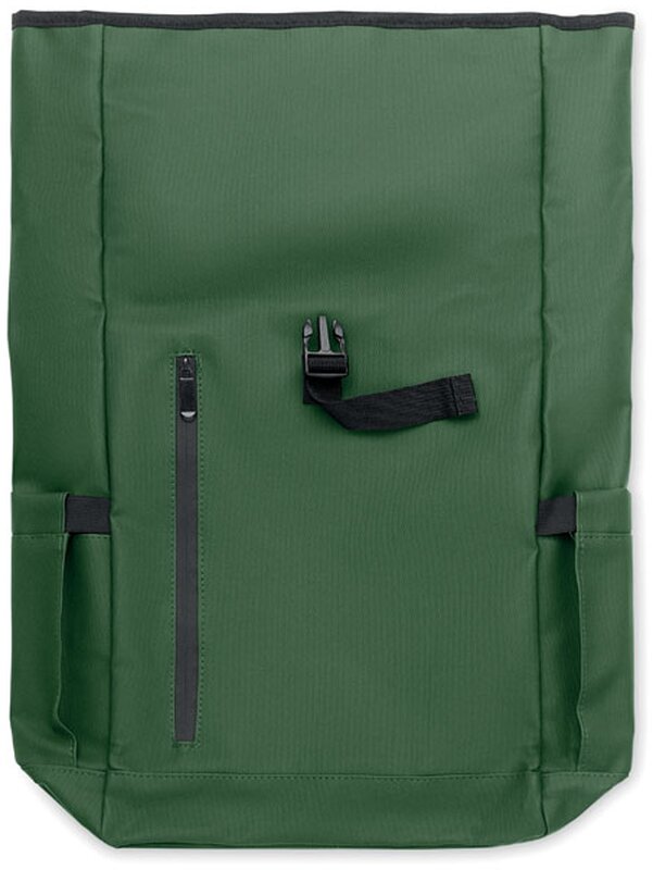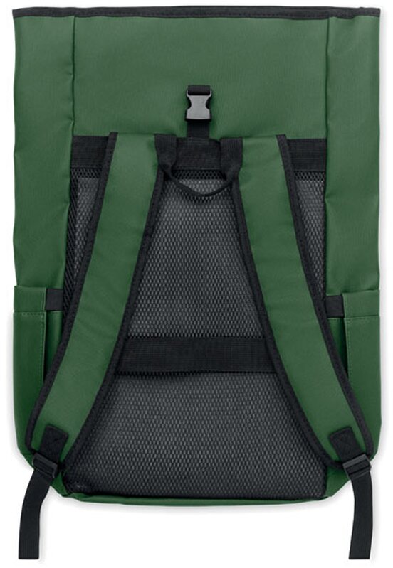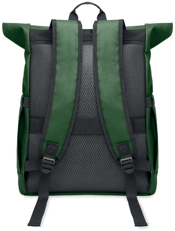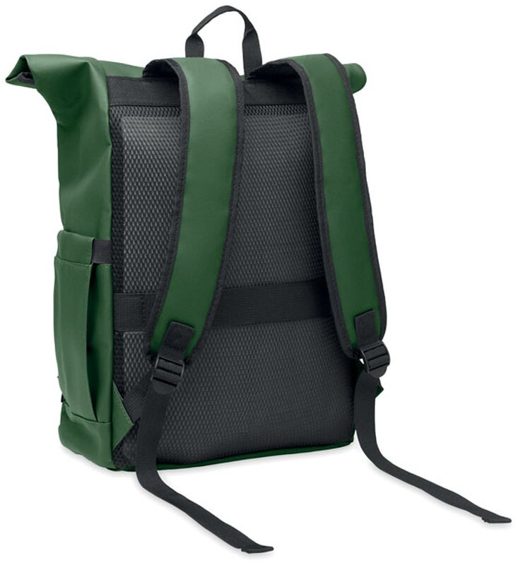 Rolovací batoh na 15palcový notebook z polyesteru RPET 600D potaženého PU s podšívkou z polyesteru RPET. Síťovaná polstrovaná záda s kapsou na zip a popruhem na kufr na kolečkách. Polstrovaný ramenní popruh se síťovanou vnitřní úpravou.