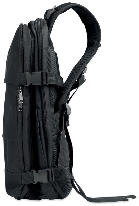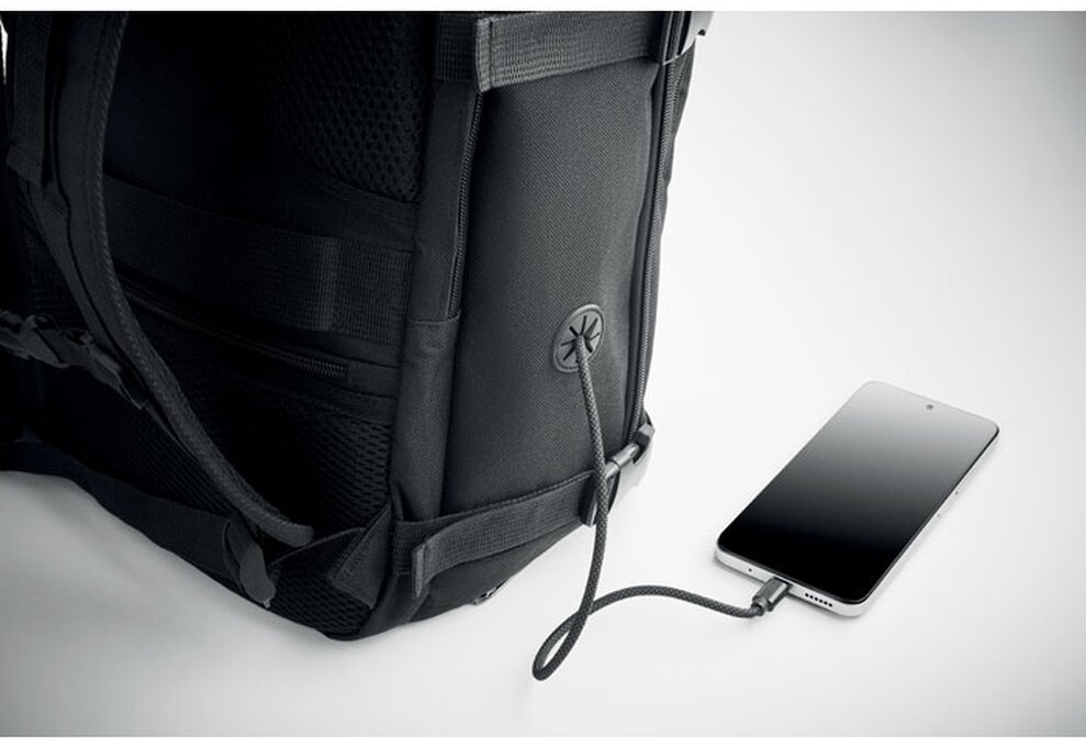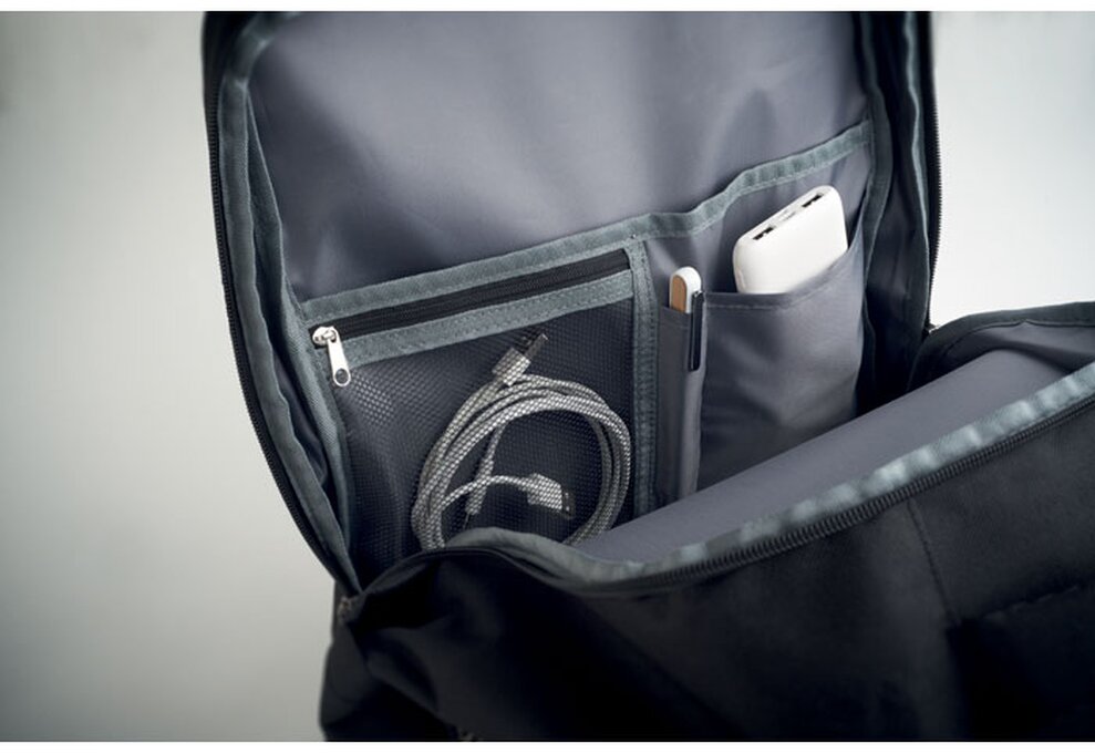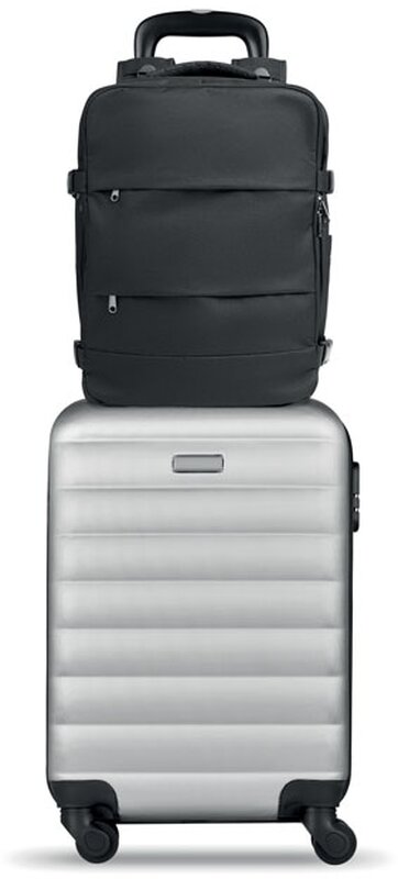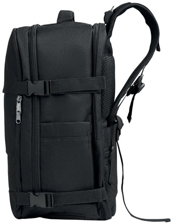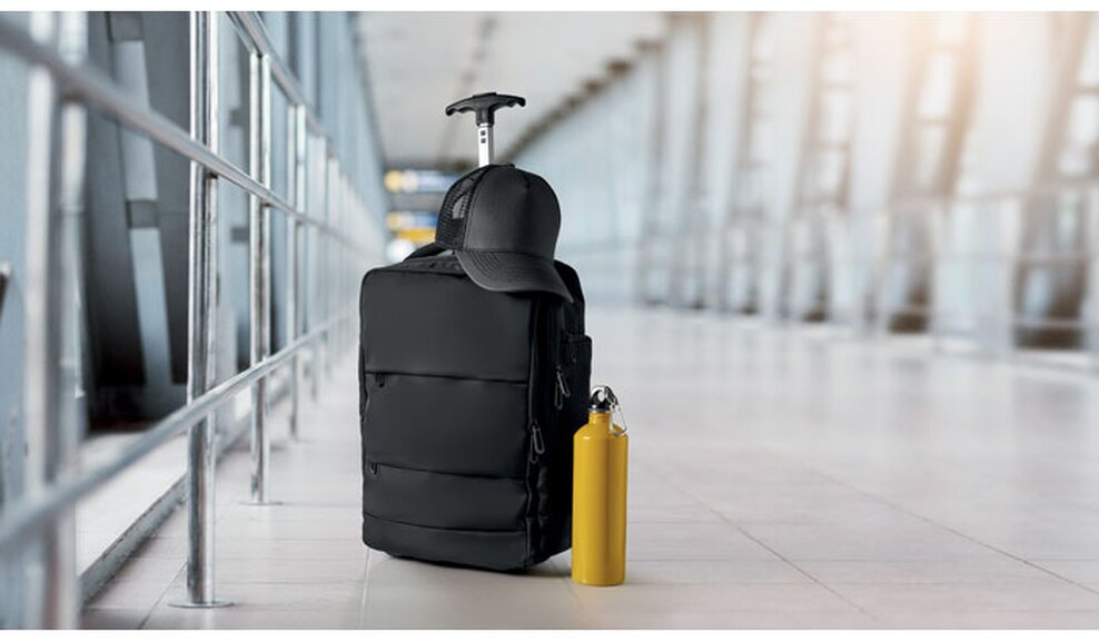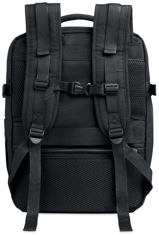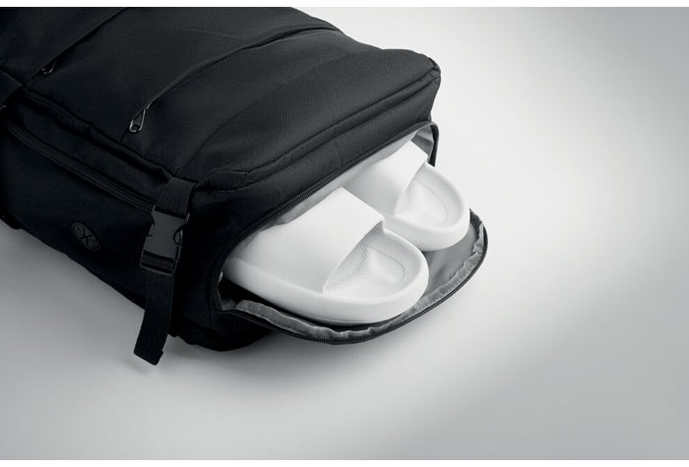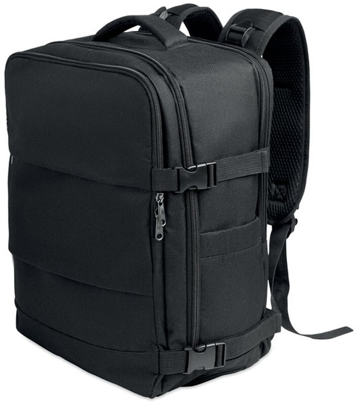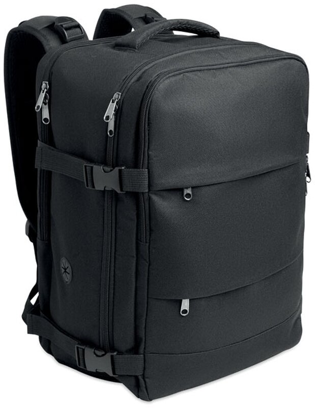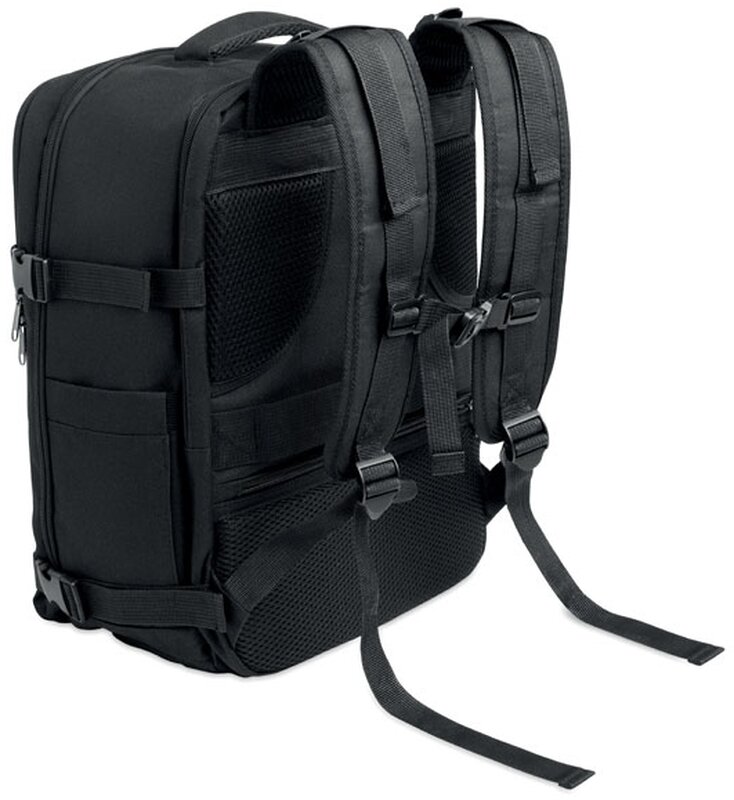 Rozšiřitelný kabinový batoh z polyesteru 600D RPET s PU zátěrem a otevíráním pod úhlem 180. Prostor na boty, polstrovaná kapsa na 15'' notebook, síťované popruhy, popruh na zavazadla a boční přezky.