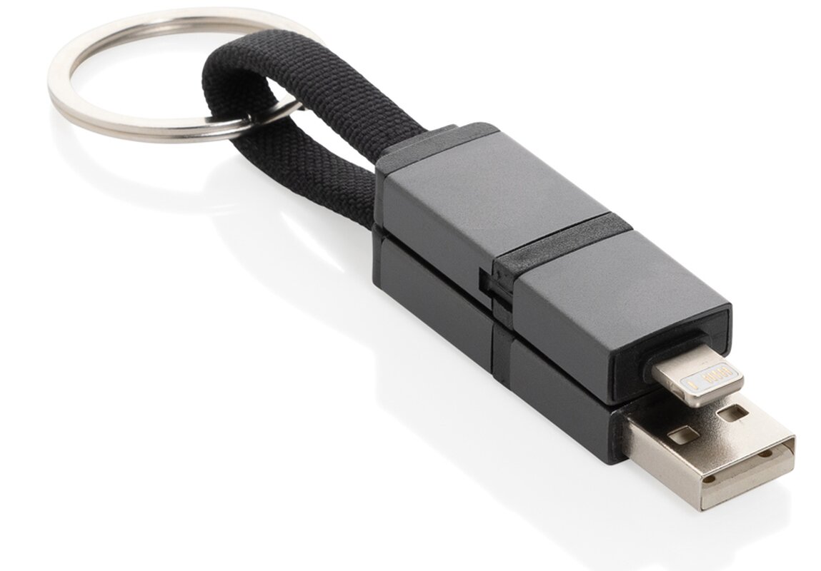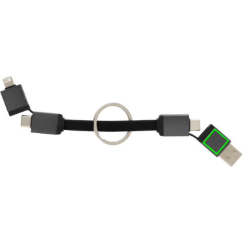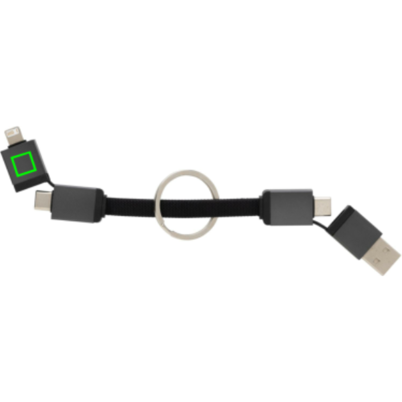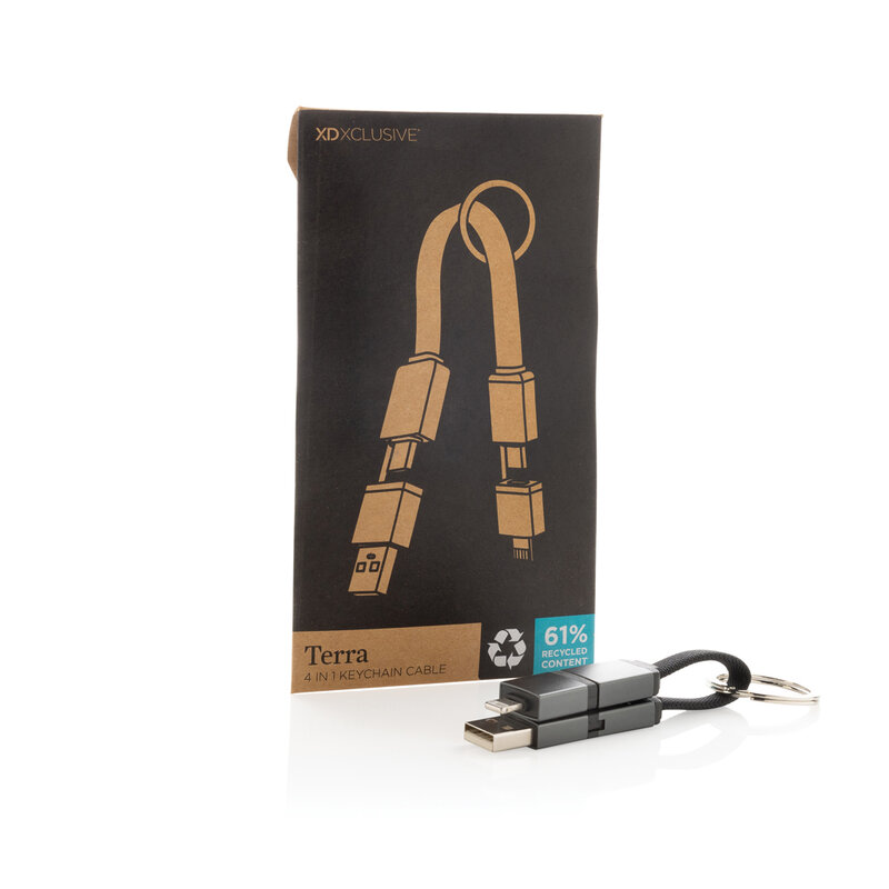 Rychlonabíjecí kabel Terra 4v1 s výkonem 60W a praktickou klíčenkou z recyklovaného TPE, hliníku a PET s RCS certifikací, ideální pro firemní potisk. USB-A a USB-C vstupy, iOS a USB-C výstupy nabízejí univerzální řešení pro různá zařízení. Díky výkonu 60W vhodný i pro náročnější zařízení. Magnetické konektory umožňují sepnutí k sobě pro úhledné uložení.