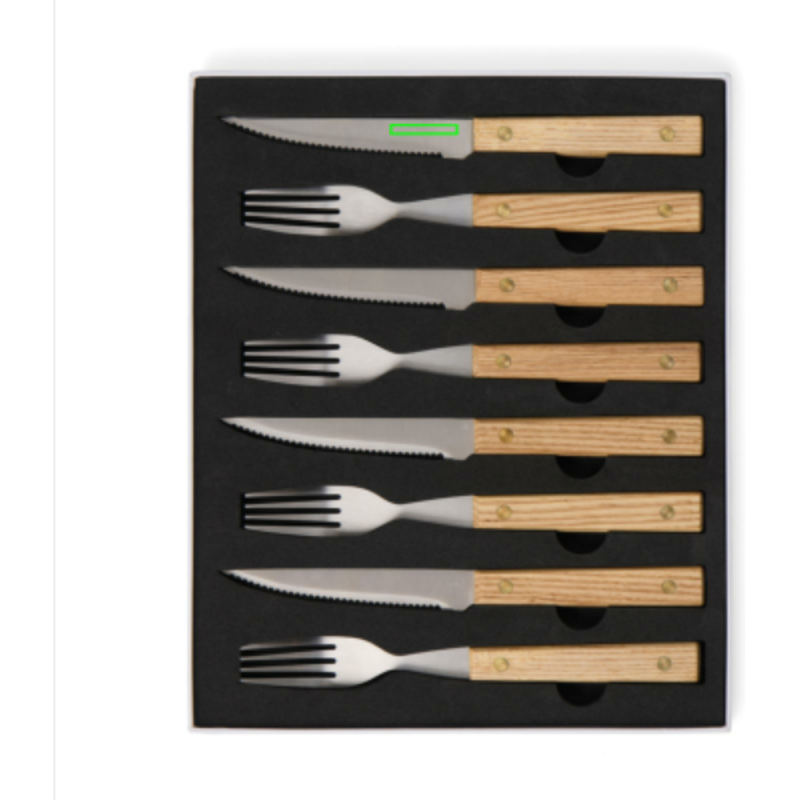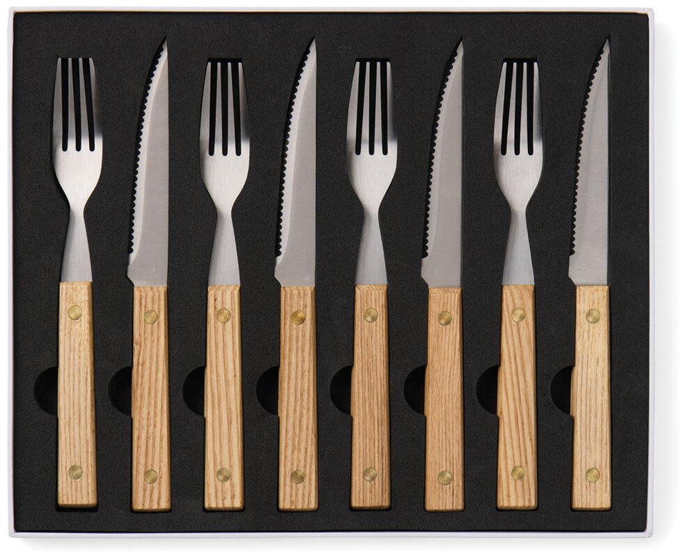 Sada je vyrobena z kombinace vysoce kvalitní nerezové oceli a jasanového dřeva s certifikací FSC®, které zaručuje odpovědný původ použitého materiálu. V praktickém balení najdete čtyři ostré steakové nože a čtyři robustní vidličky.