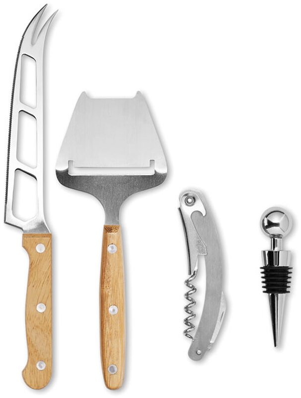 Bambusová sada na sýr a víno. Zahrnuje nerezový nůž, škrabku na sýry, otvírák na láhve a zátku na víno. Prezentováno v bambusové krabici.