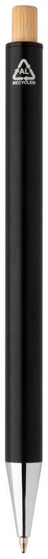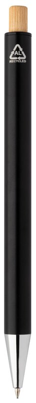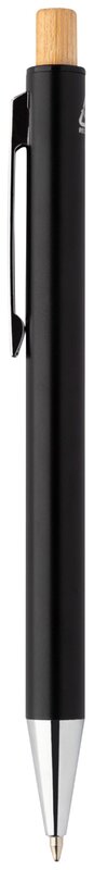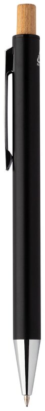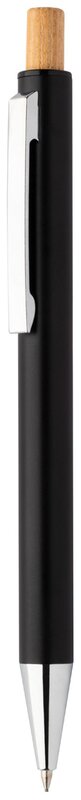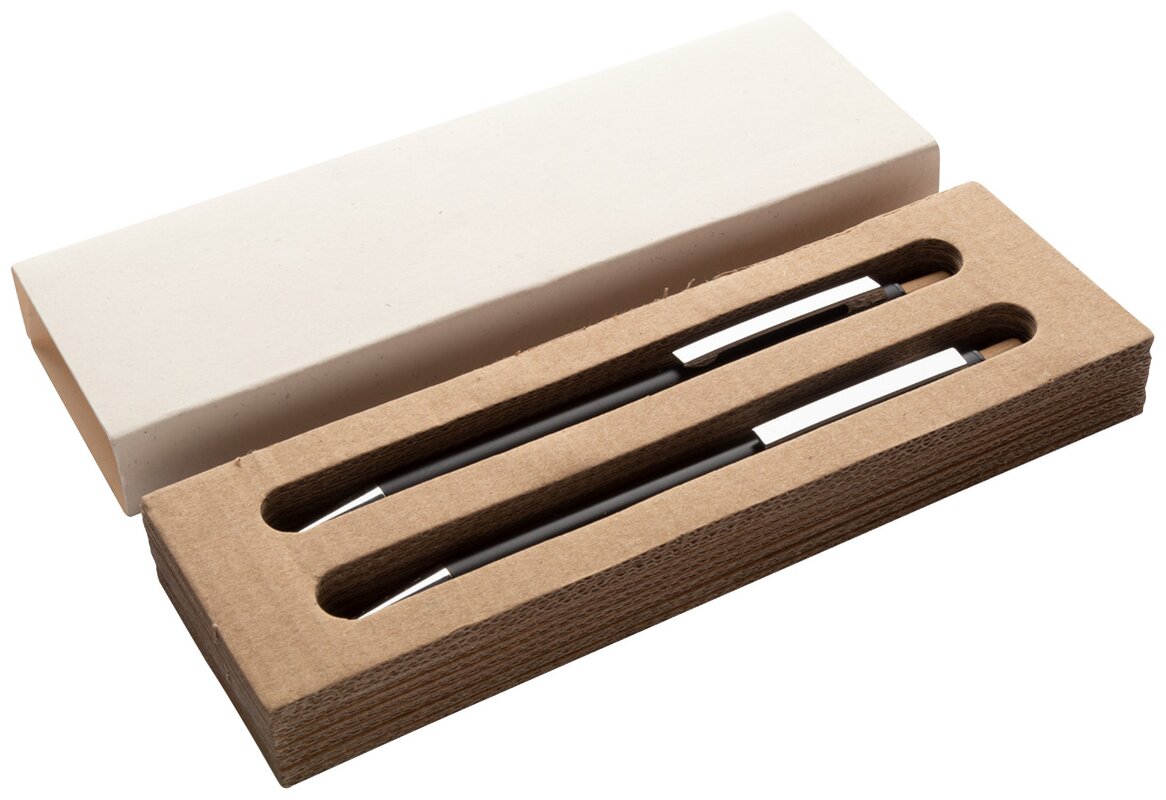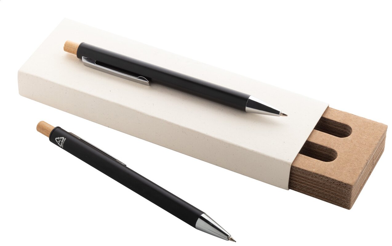 Sada pera z recyklovaného hliníku s kuličkovým perem a mechanickou tužkou s bambusovými knoflíky. S modrou náplní a 0,7 mm tuhy. V kraftové papírové krabici.