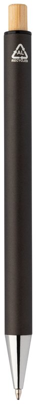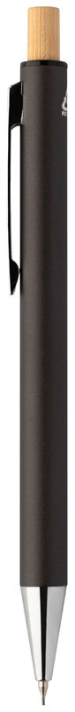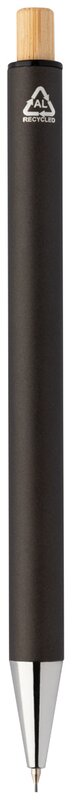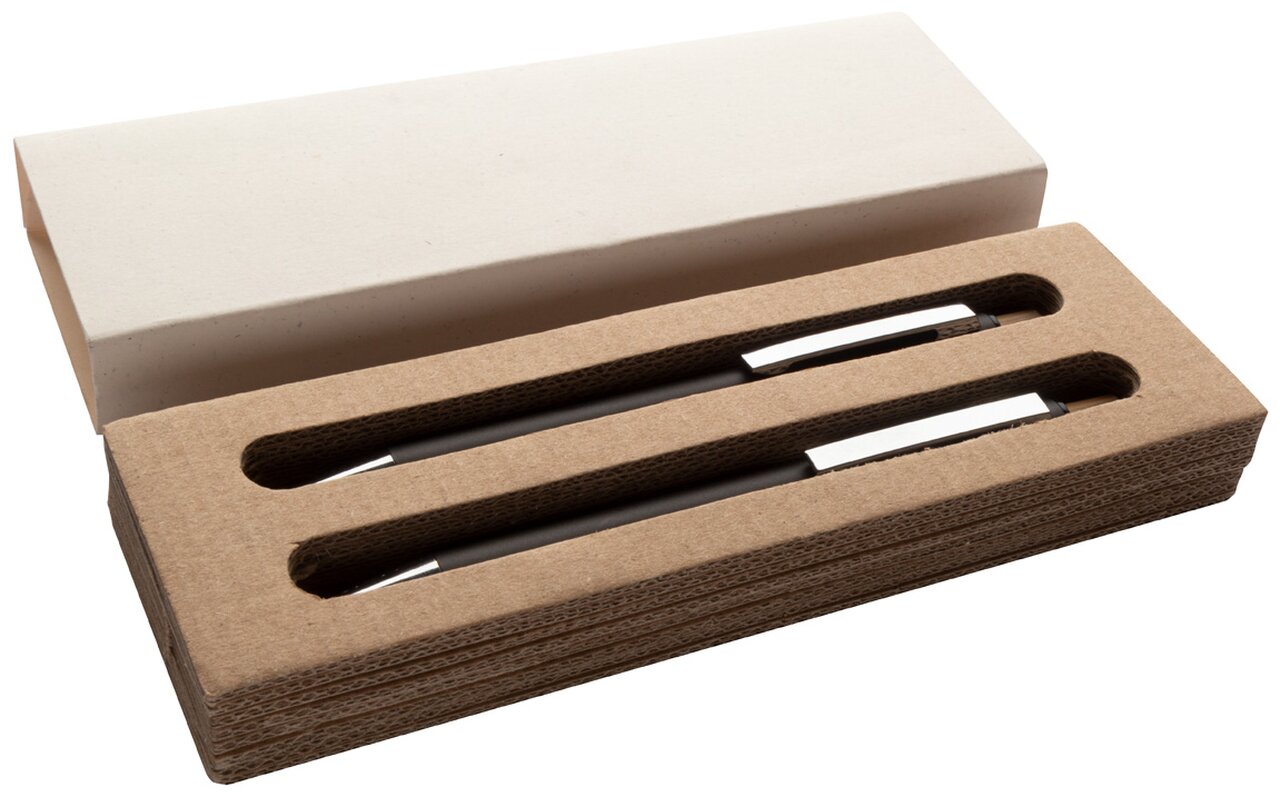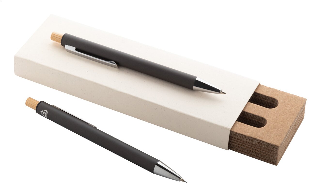 Sada pera z recyklovaného hliníku s kuličkovým perem a mechanickou tužkou s bambusovými knoflíky. S modrou náplní a 0,7 mm tuhy. V kraftové papírové krabici.