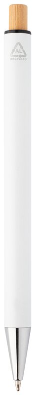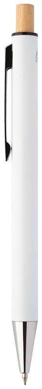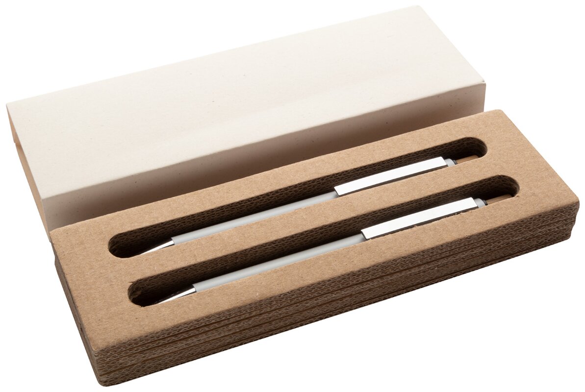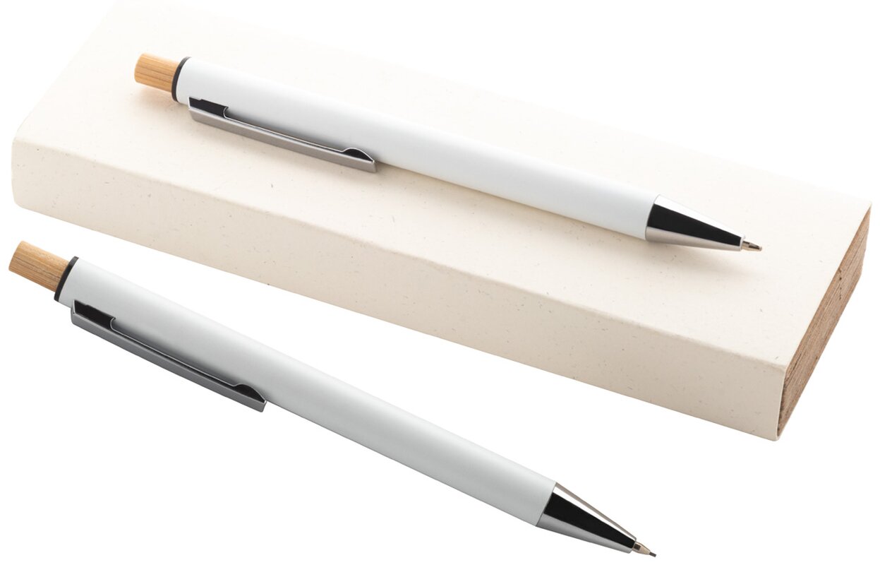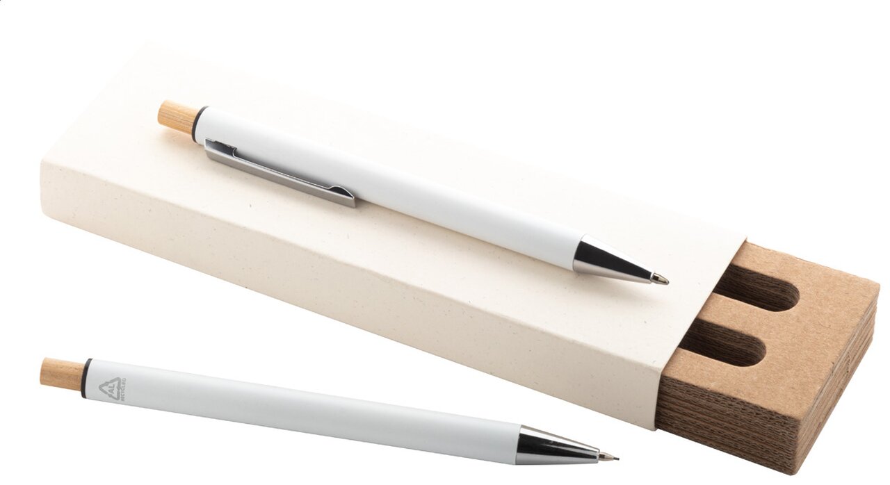 Sada pera z recyklovaného hliníku s kuličkovým perem a mechanickou tužkou s bambusovými knoflíky. S modrou náplní a 0,7 mm tuhy. V kraftové papírové krabici.