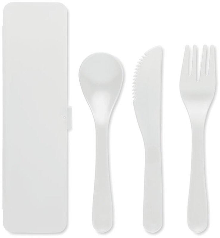 Opakovaně použitelná přenosná sada plastových příborů s pouzdrem. Obsahuje lžíci, vidličku a nůž.