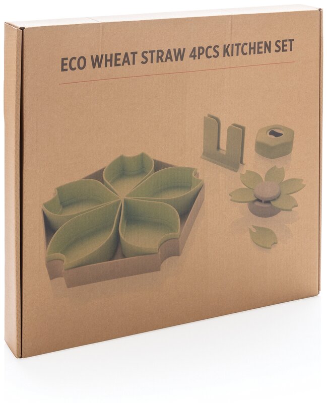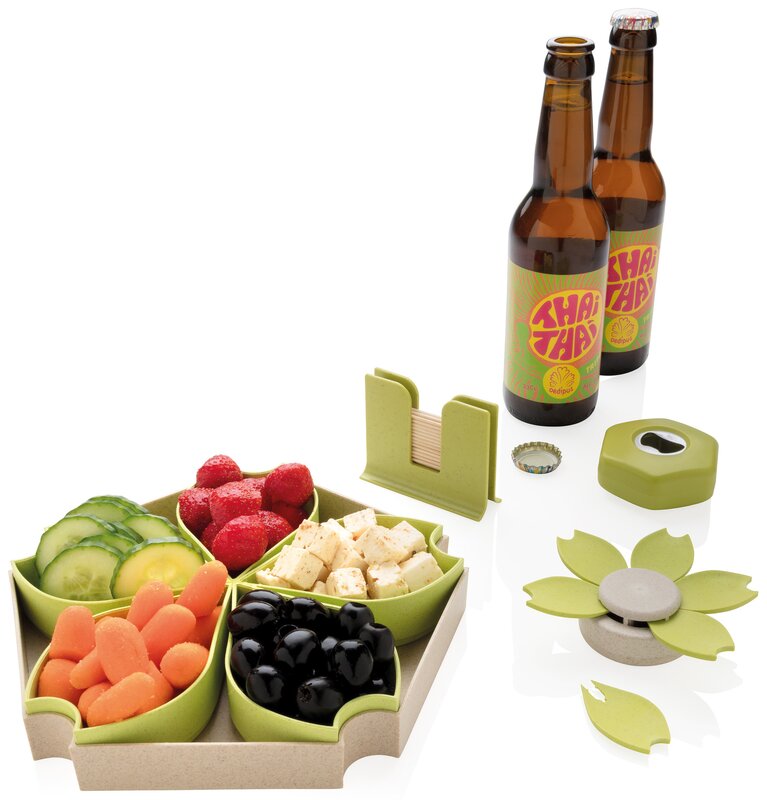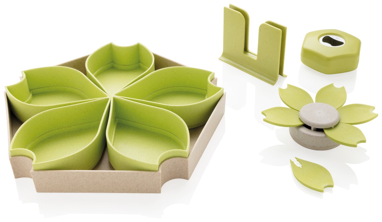 Moderní servírovací set z biologicky rozložitelné pšeničné slámy se skvěle hodí do každé kuchyně. Set obsahuje 1 velkou misku, do které dáte 5 vyjmutelných menších mističek, dále podavač párátek, otvírák a set 6 vidliček ve tvaru květiny.
