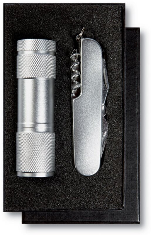 Set kapesního nože s jedenácti funkcemi a kompaktní metalickou svítilnou s 9 LED bílými žárovkami v hliníkovém vzhledu. 3 AAA baterie nejsou součástí balení. V dárkovém balení.