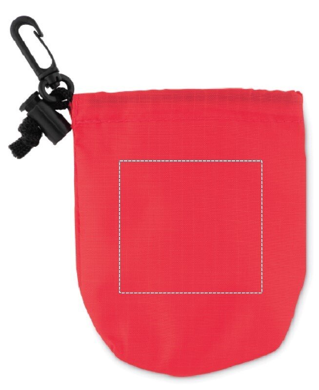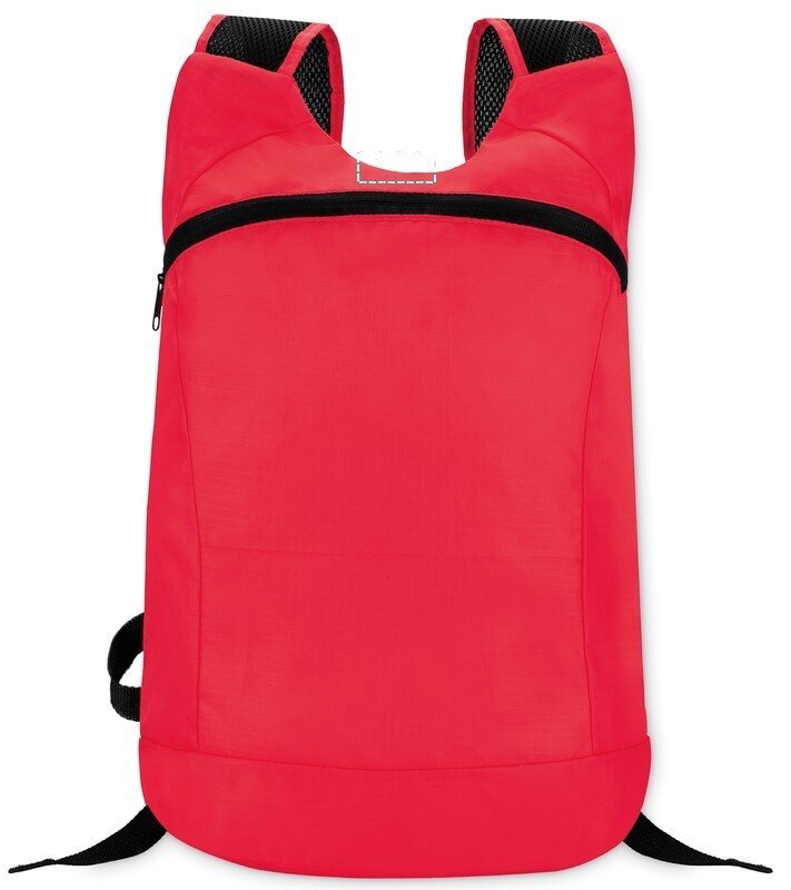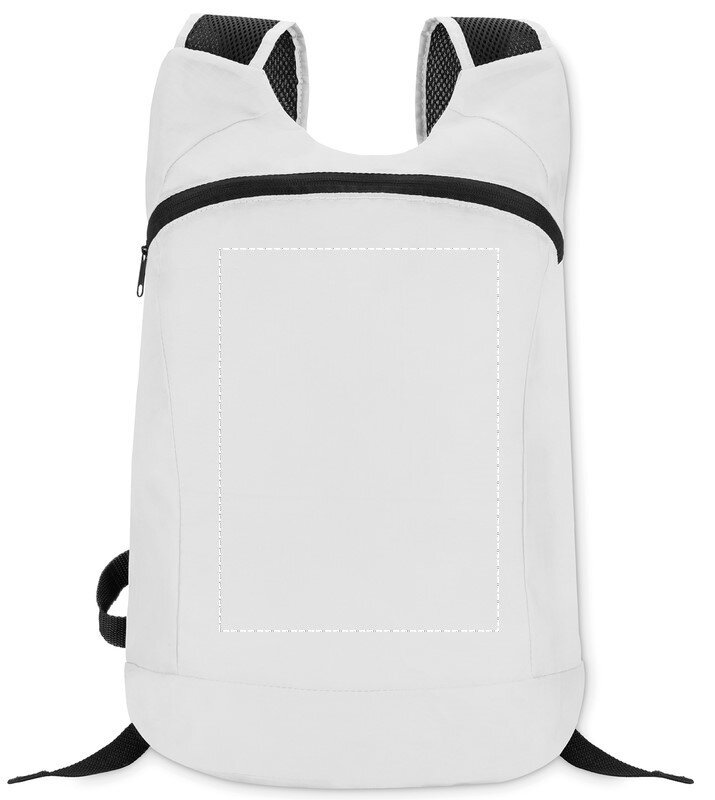 Skládací batoh z pevného polyesteru s předním otvíráním na zip, popruhy ze síťoviny a oddělitelným sáčkem.