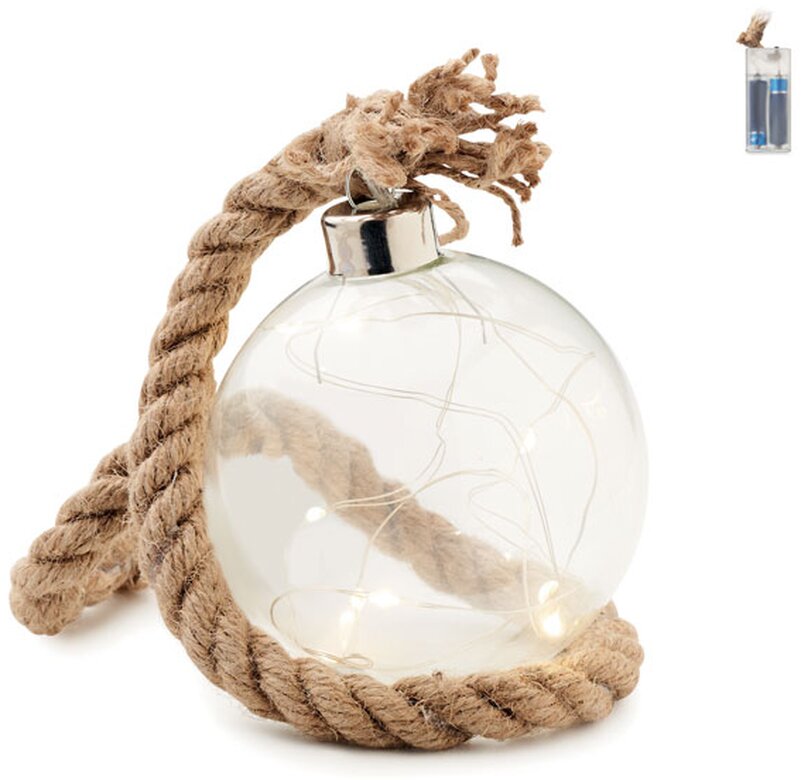 Skleněná koule BAUBLI s osmi LED světélky v teplých žlutých barvách a jutovou šňůrou. Dodáváno bez 2 baterií AA.